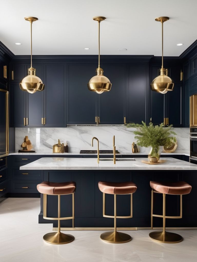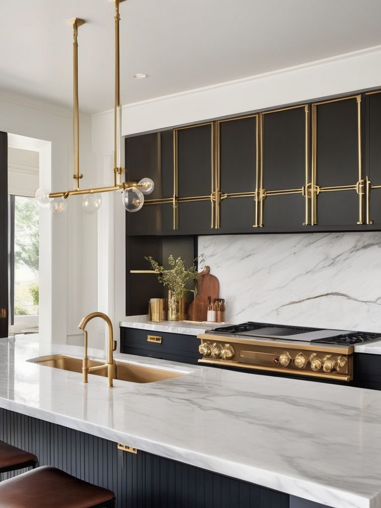 Black marble countertops, Gold or brass accents, Opulent kitchen finishes, Luxurious marble countertops, Sophisticated kitchen designDescription