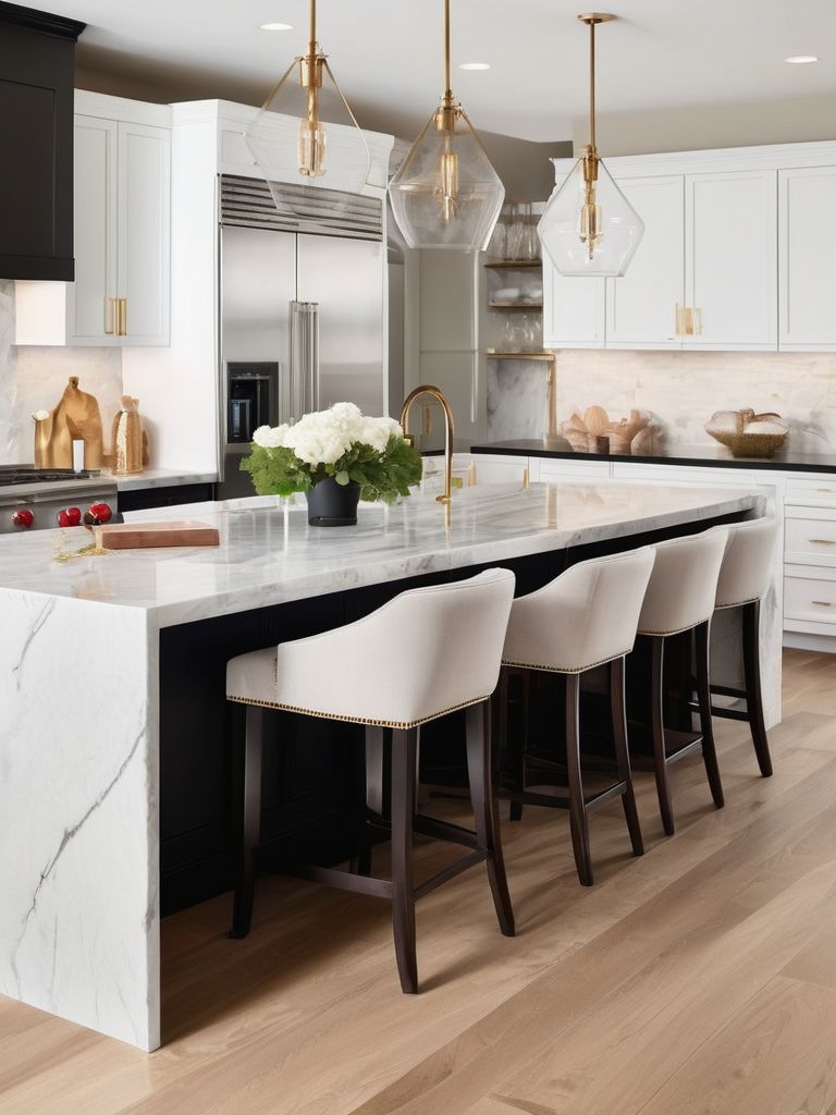 Transform your kitchen with opulent finishes and marble countertops that exude luxury and elegance. Consider incorporating sleek, black marble countertops for a modern and sophisticated touch, and complement them with gold or brass accents for a glamorous look. Embrace the richness and sophistication of marble to create a kitchen that is both functional and stunning, adding a touch of luxury to your daily routine.