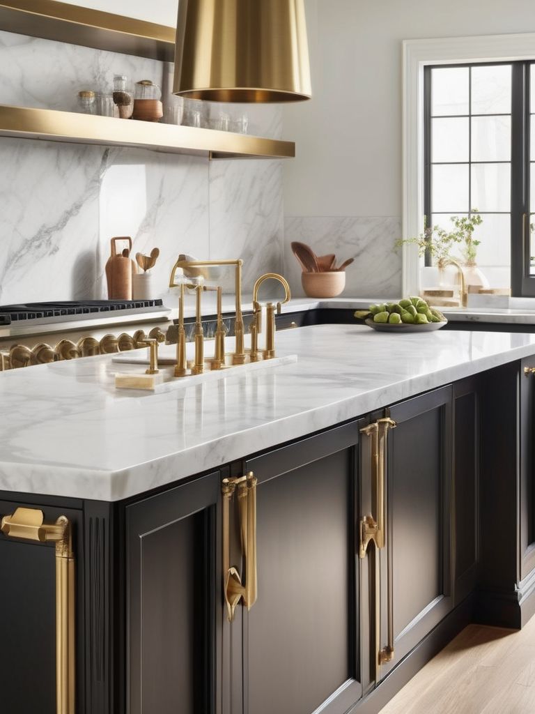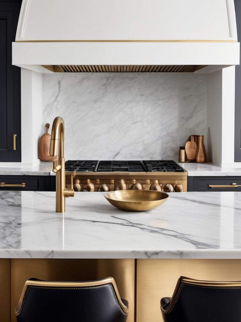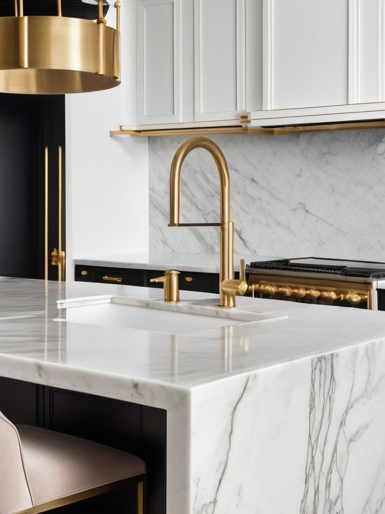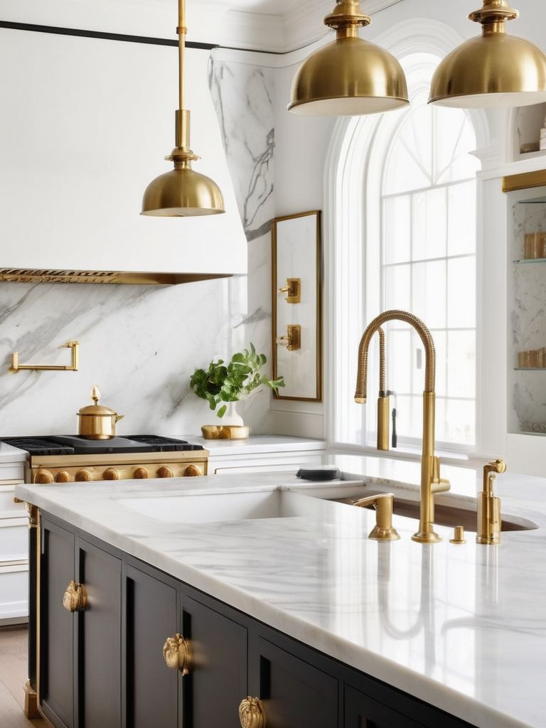 Transform Your Kitchen with Timeless Elegance: Marble and Brass Accents for a Sophisticated and Luxurious Aesthetic