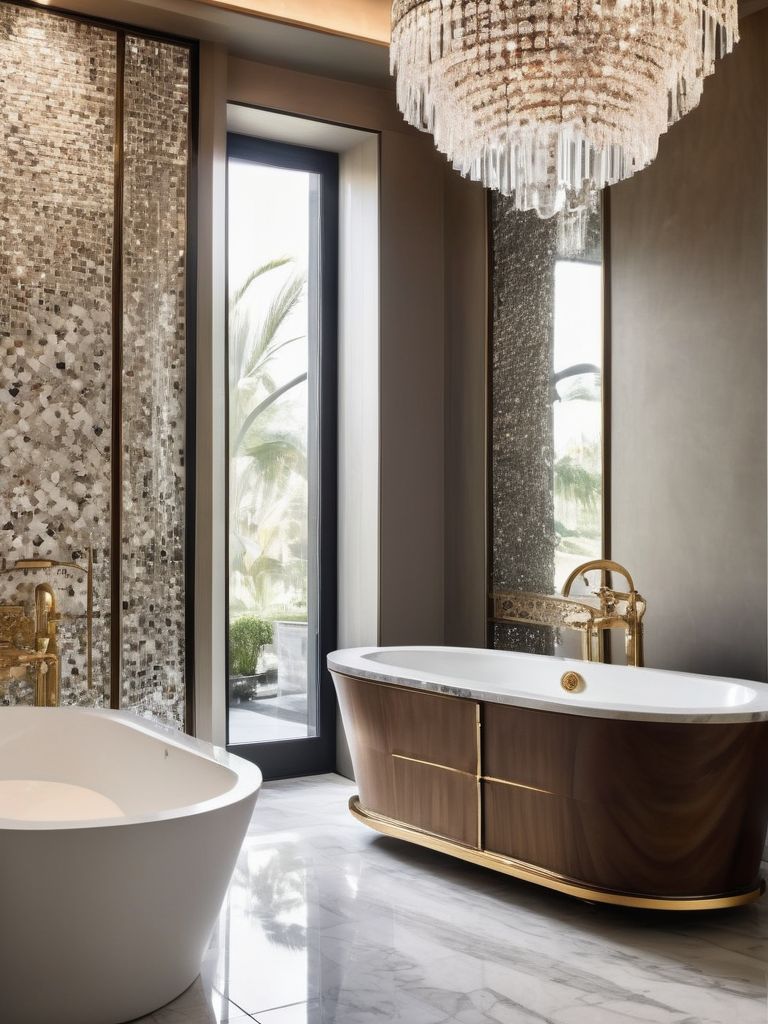 Transform your bathroom into a luxurious retreat with opulent crystal chandeliers. Incorporate intricate mosaic tiles and polished marble surfaces for a truly glamorous appeal. Consider adding plush, oversized bath towels and sleek, modern fixtures to complete the high-end aesthetic. Elevate your bathroom design with a focus on sophisticated opulence and indulgent comfort.