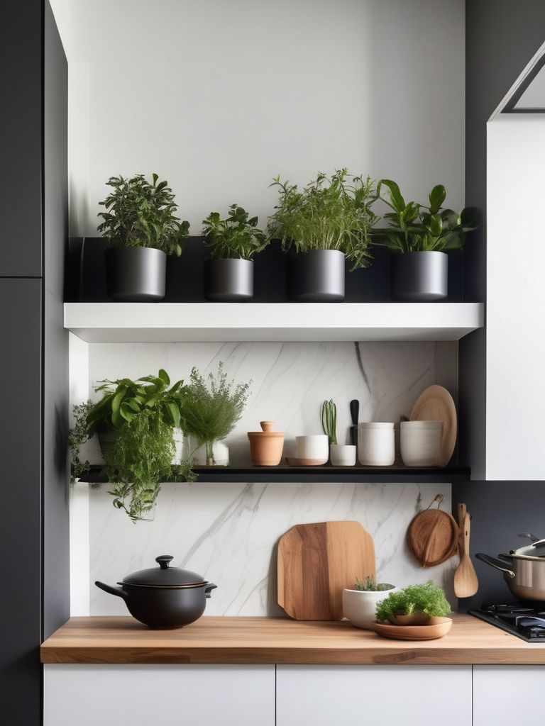 Floating shelves, Potted herbs, Plants, Modern kitchen design, GreeneryDescription