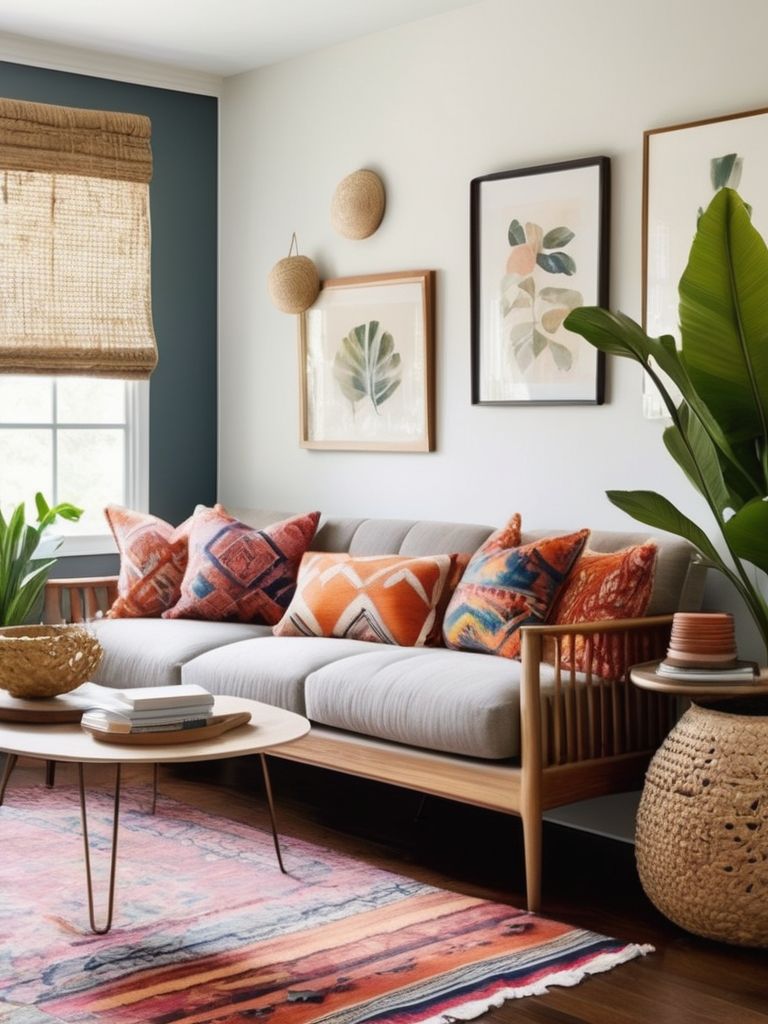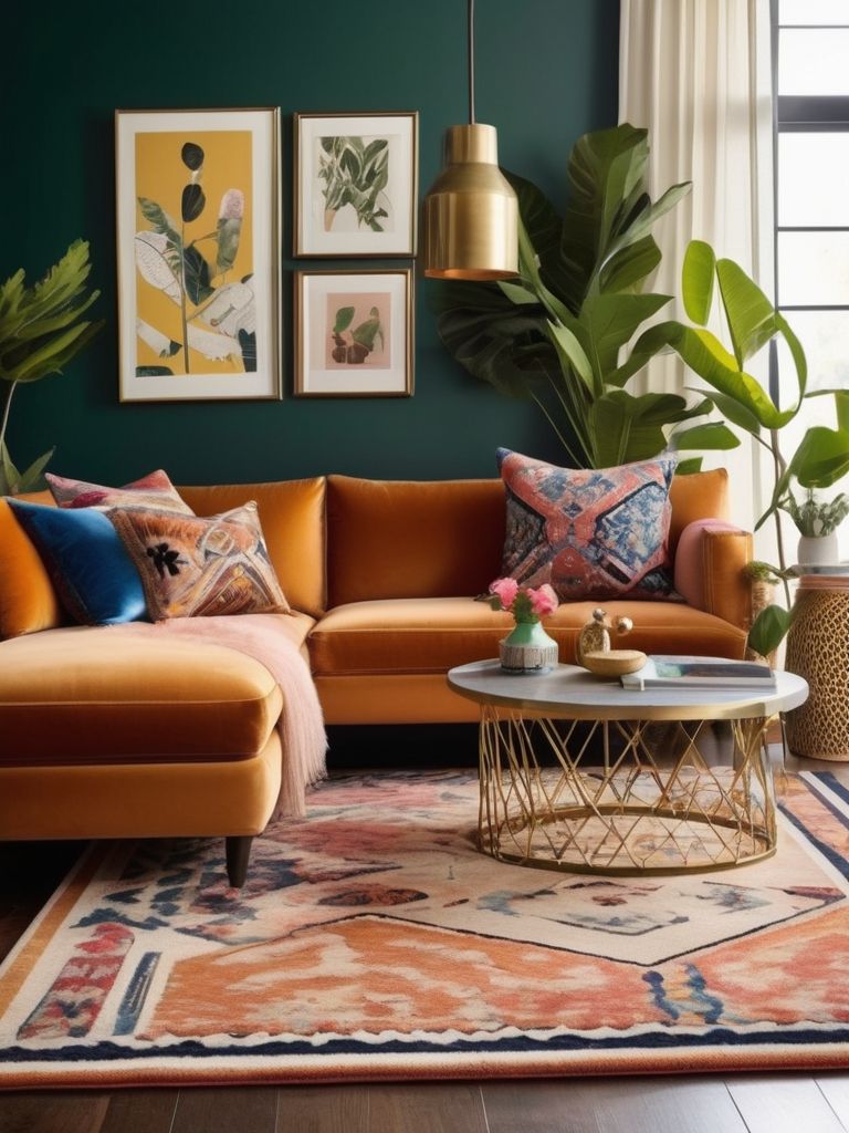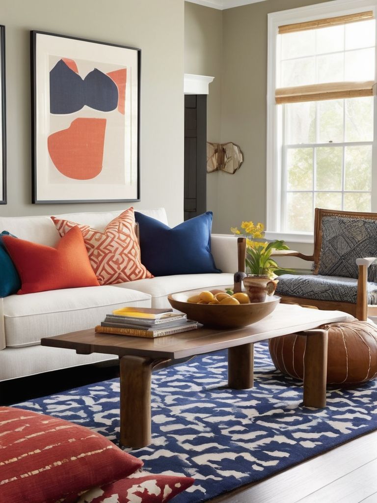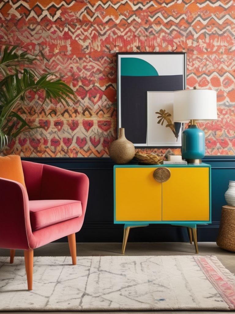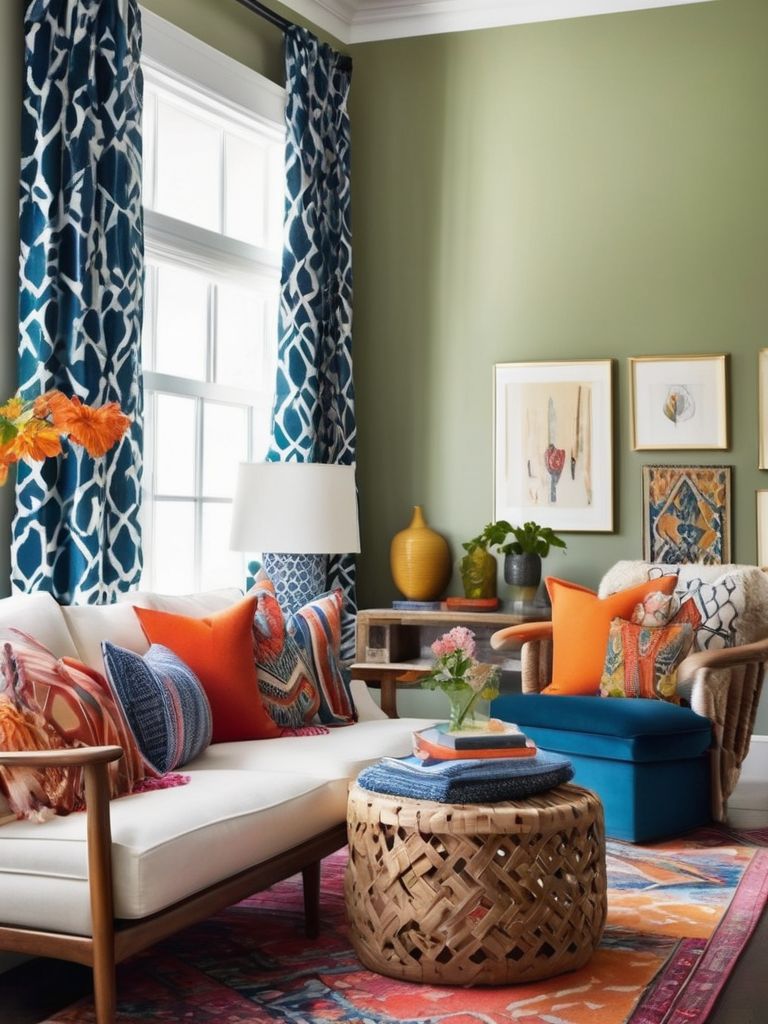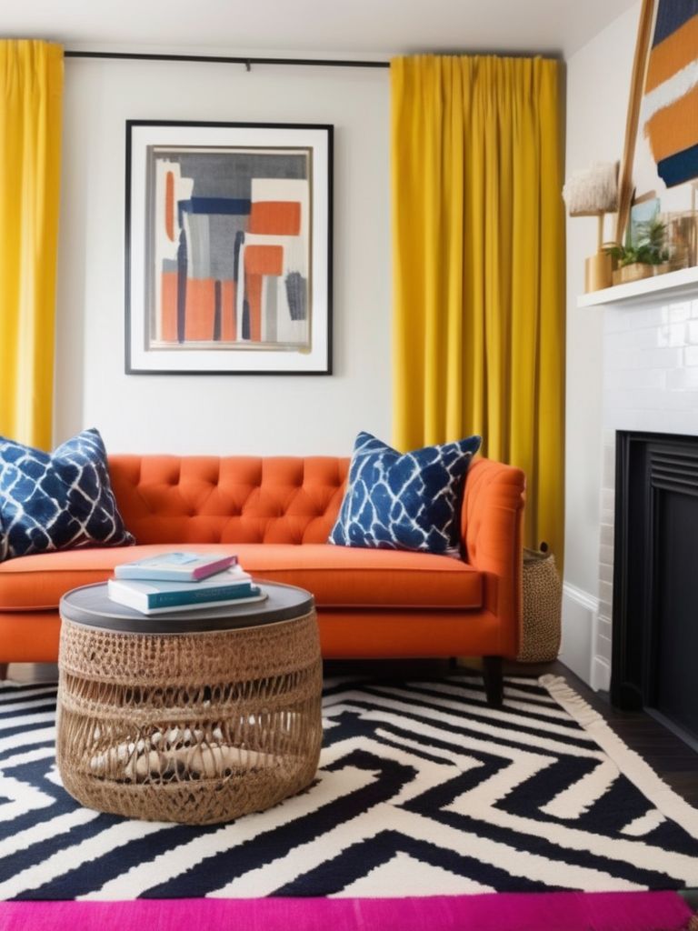 Bold-patterned area rug, Colorful accent chair, Eye-catching statement pieces, Throw pillows, CurtainsDescription