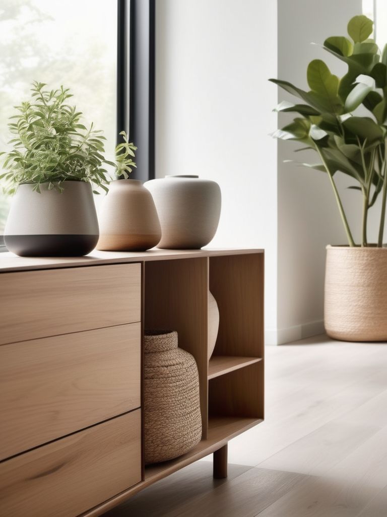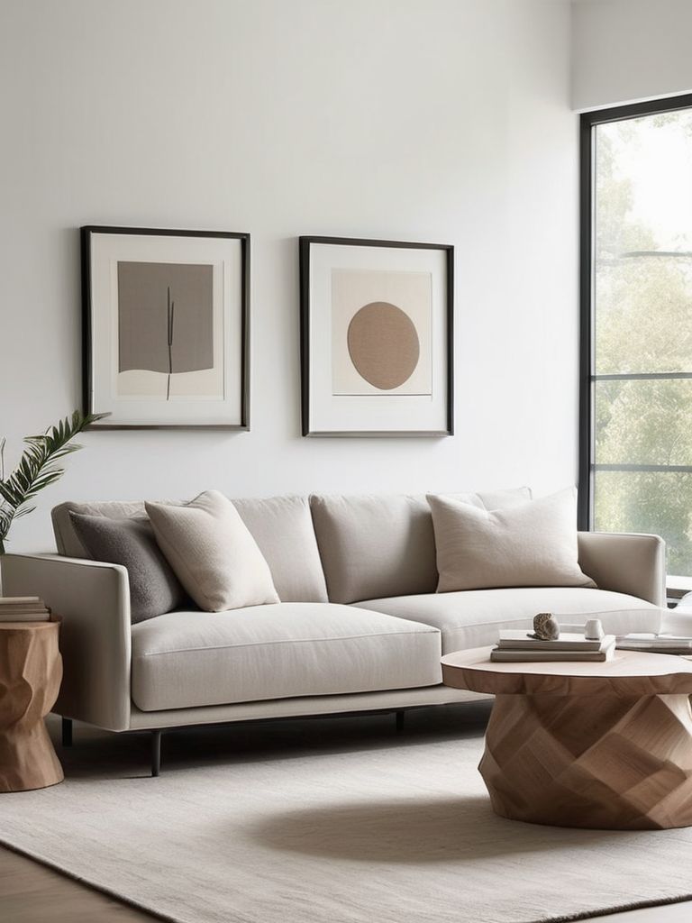 Neutral-colored sofa, Minimalist coffee table, Wooden bookshelf, Stone accent table, Simple wall artDescription
