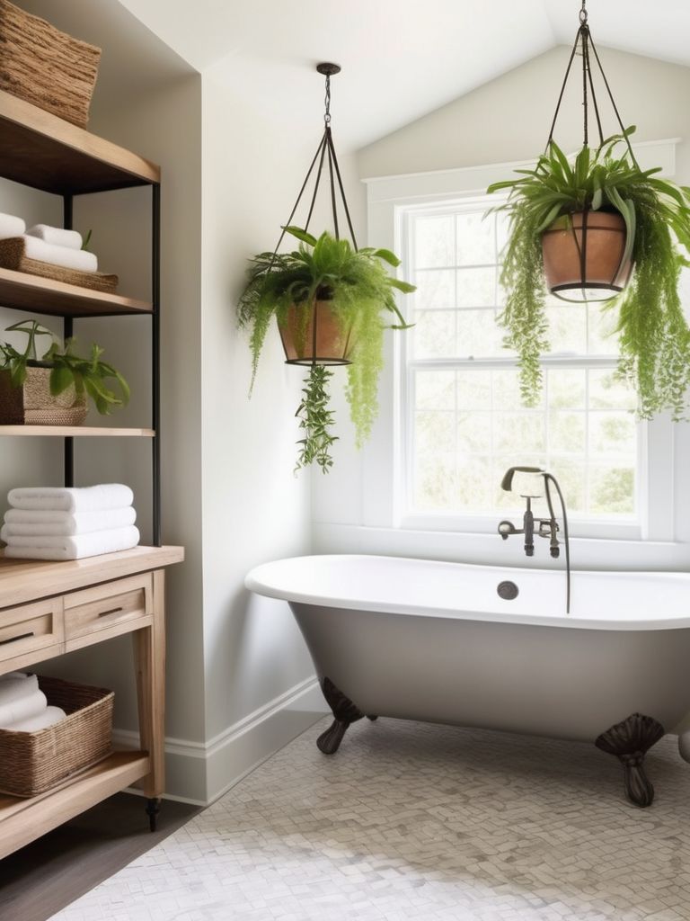 To transform your bathroom into a lush oasis with natural greenery displays, consider adding easy-to-maintain houseplants like ferns, pothos, or peace lilies. These plants thrive in the humidity of the bathroom, adding a touch of greenery to the space. You can also incorporate small potted plants on shelves or counters, or hang them from the ceiling to create a refreshing and calming atmosphere.