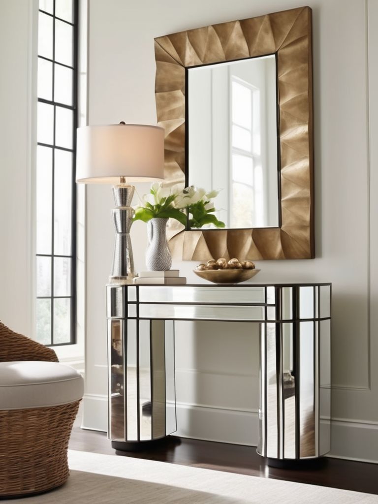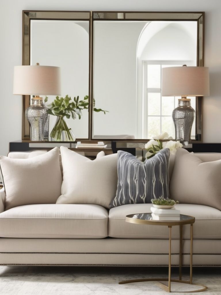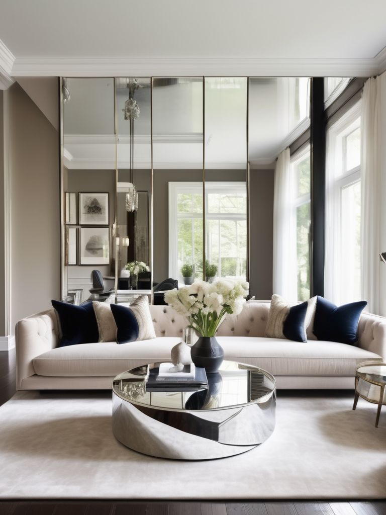 Transform Your Living Room into a Spacious Oasis with Mirrored Surfaces for an Elevated and Glamorous Ambiance