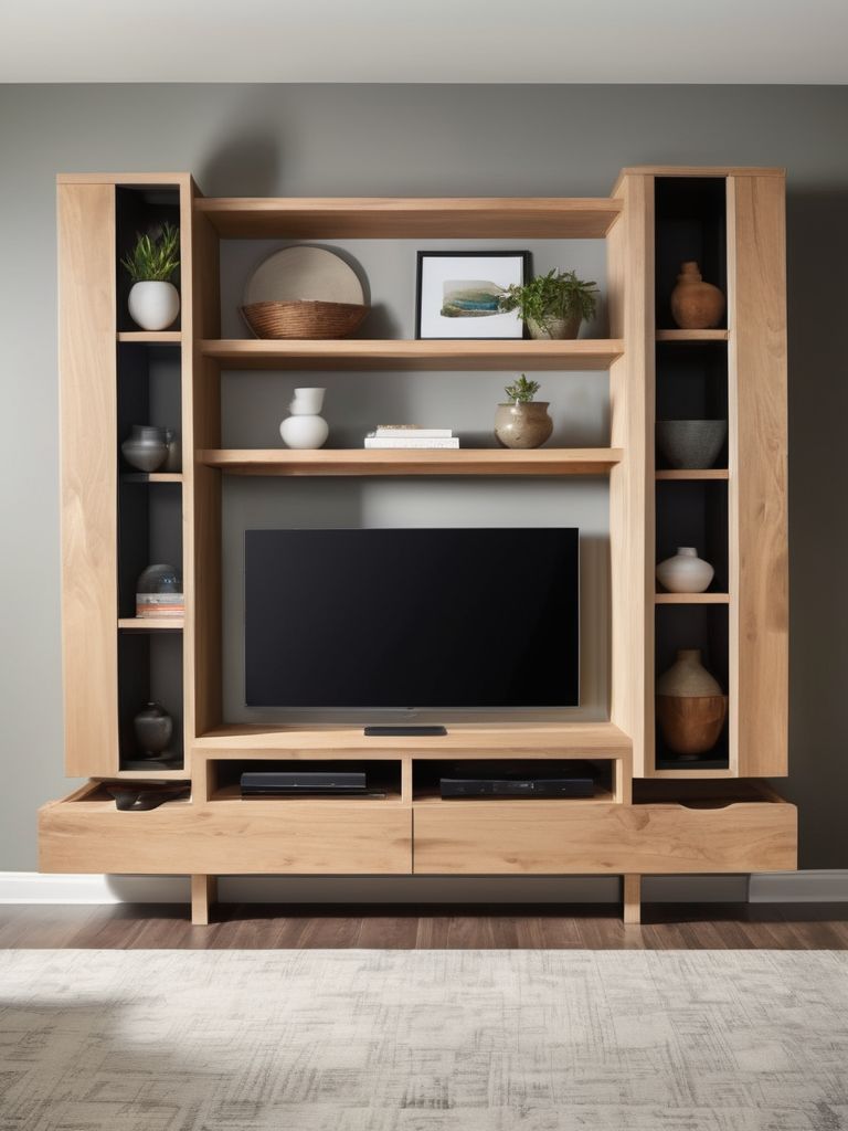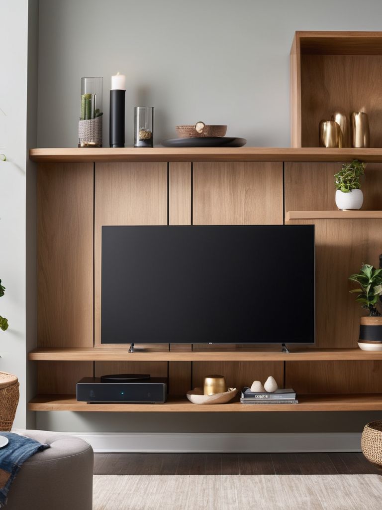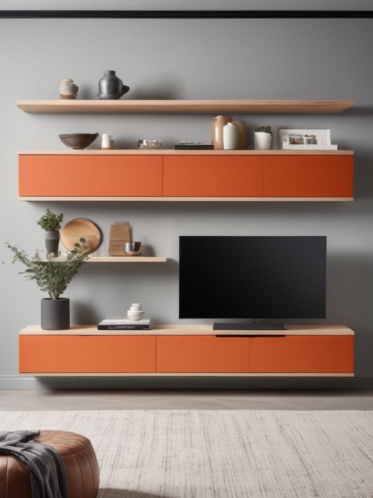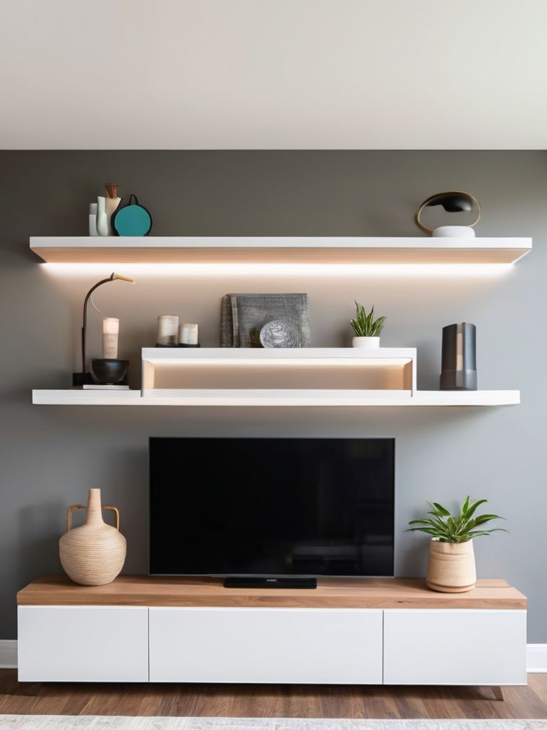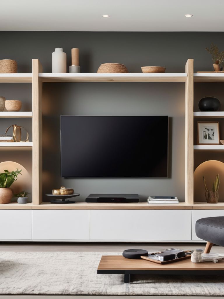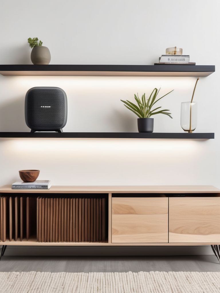 Smart shelving units, Multifunctional furniture, Shelves with built-in wireless charging pads, LED-lit display cases for smart devices, Hidden cable management systemsDescription