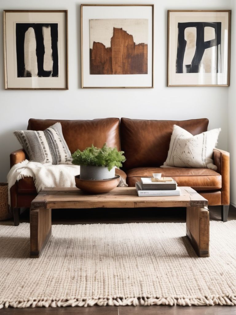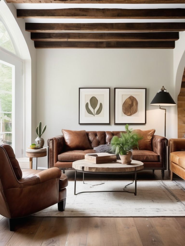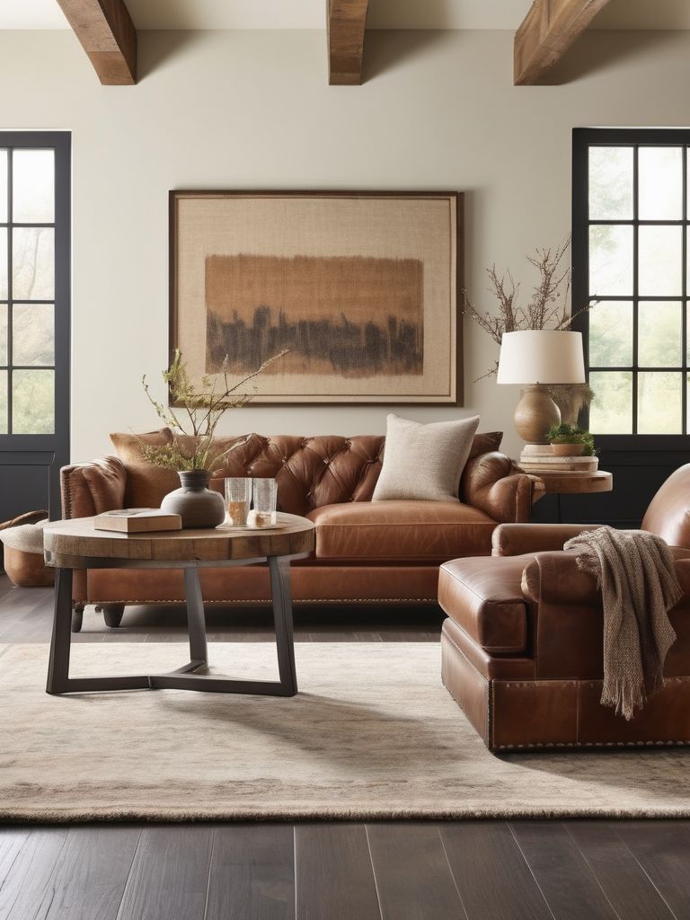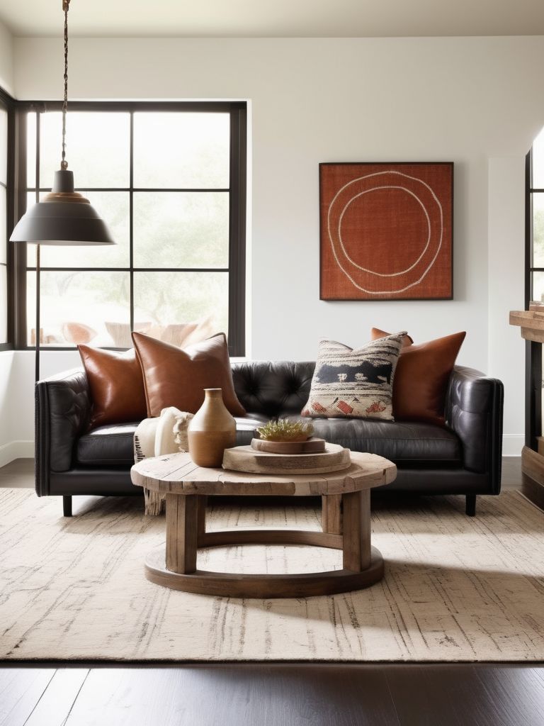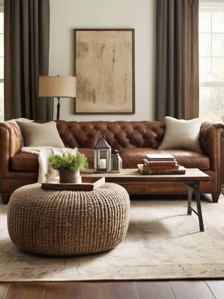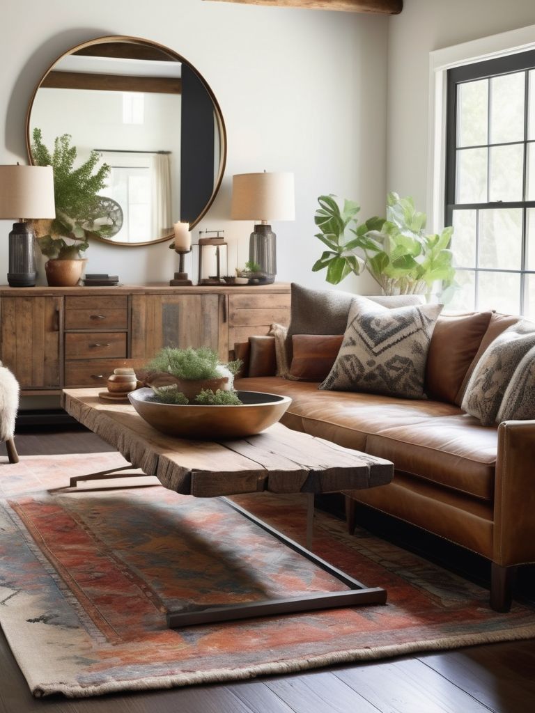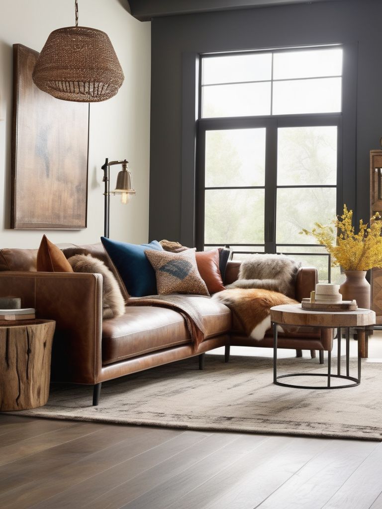 Distressed leather sofas, Wooden coffee tables, Antique rugs, Metallic accents, Sleek lighting fixturesDescription