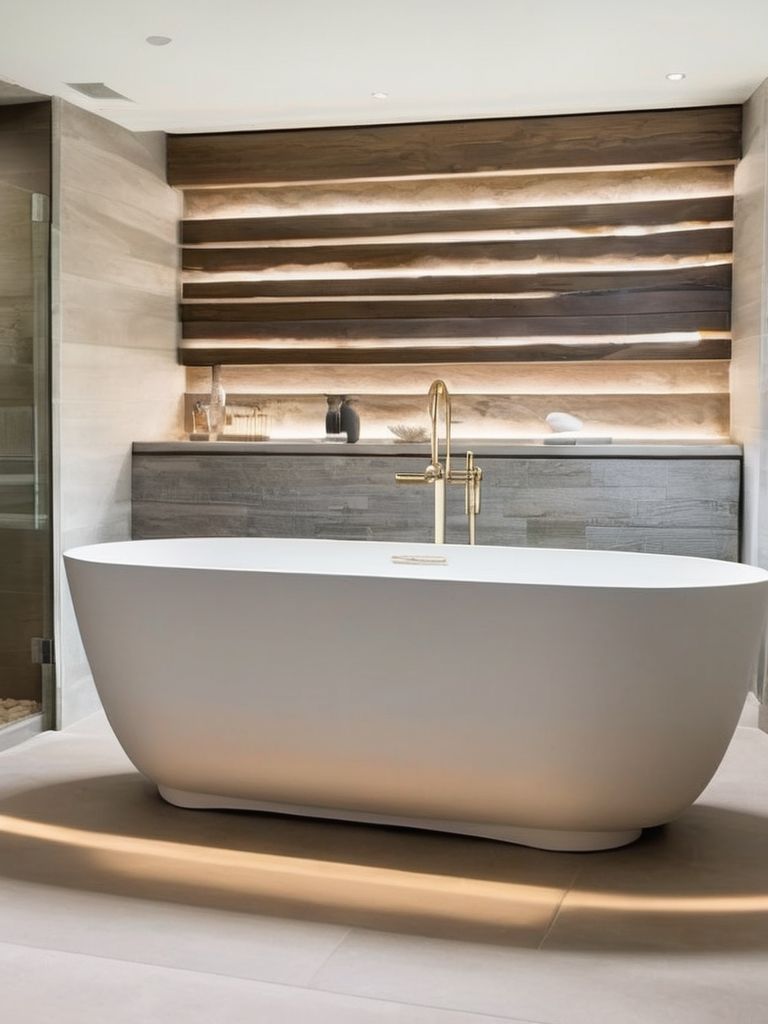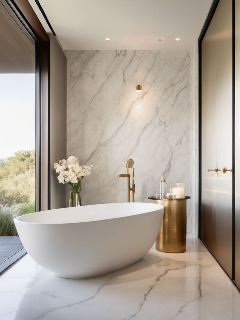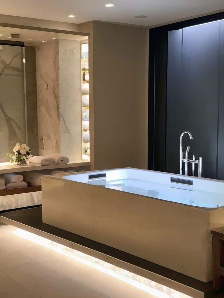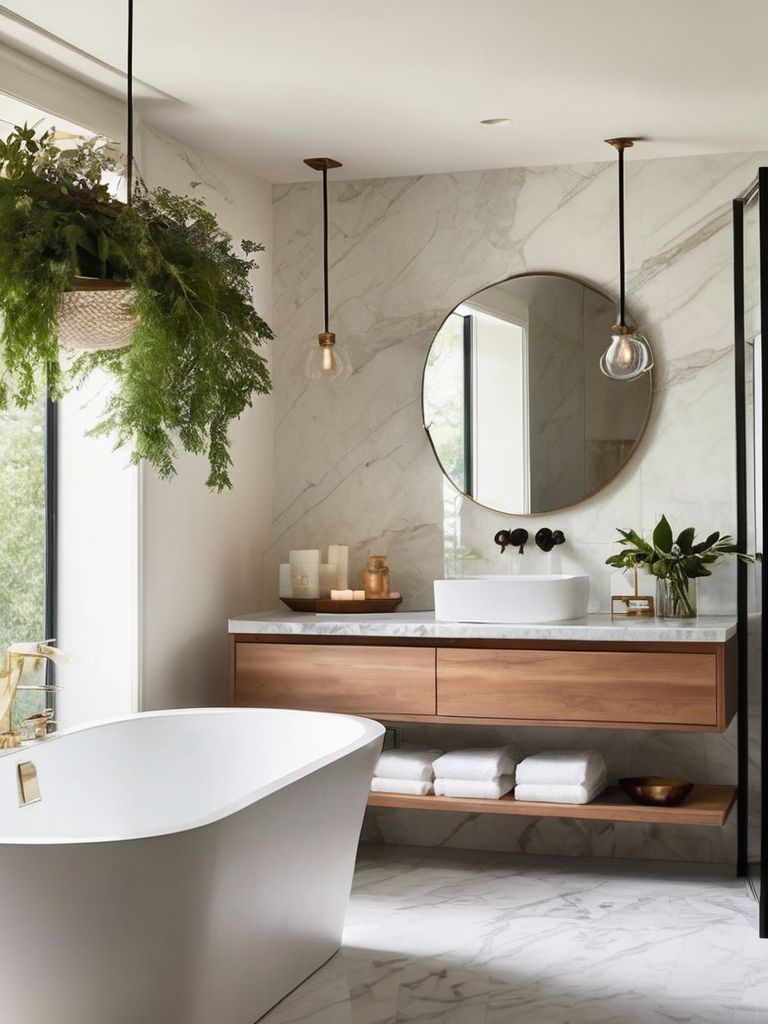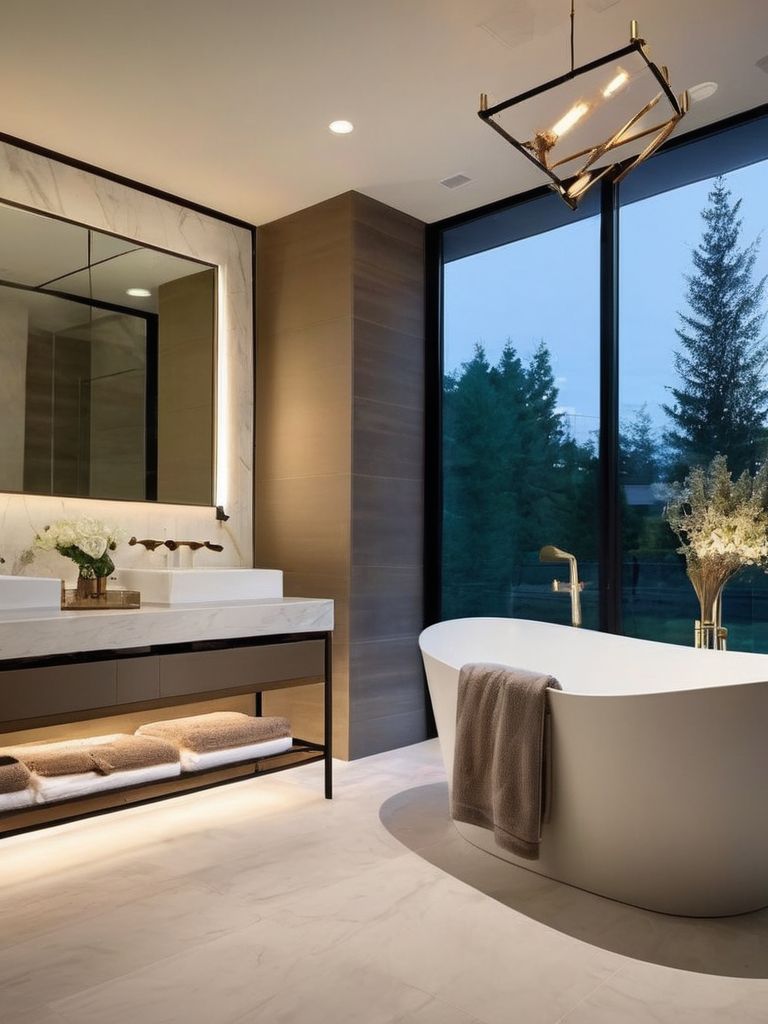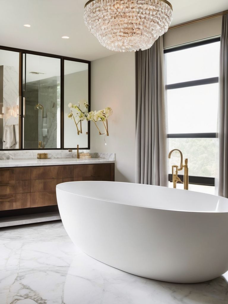 Freestanding bathtub, Marble or natural stone flooring, Soft lighting, Plush textiles, Statement chandelier or pendant lights, Modern vanity, Elegant fixturesDescription