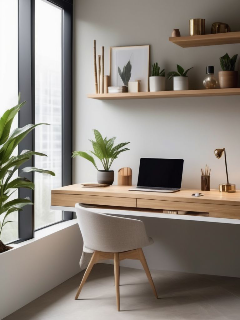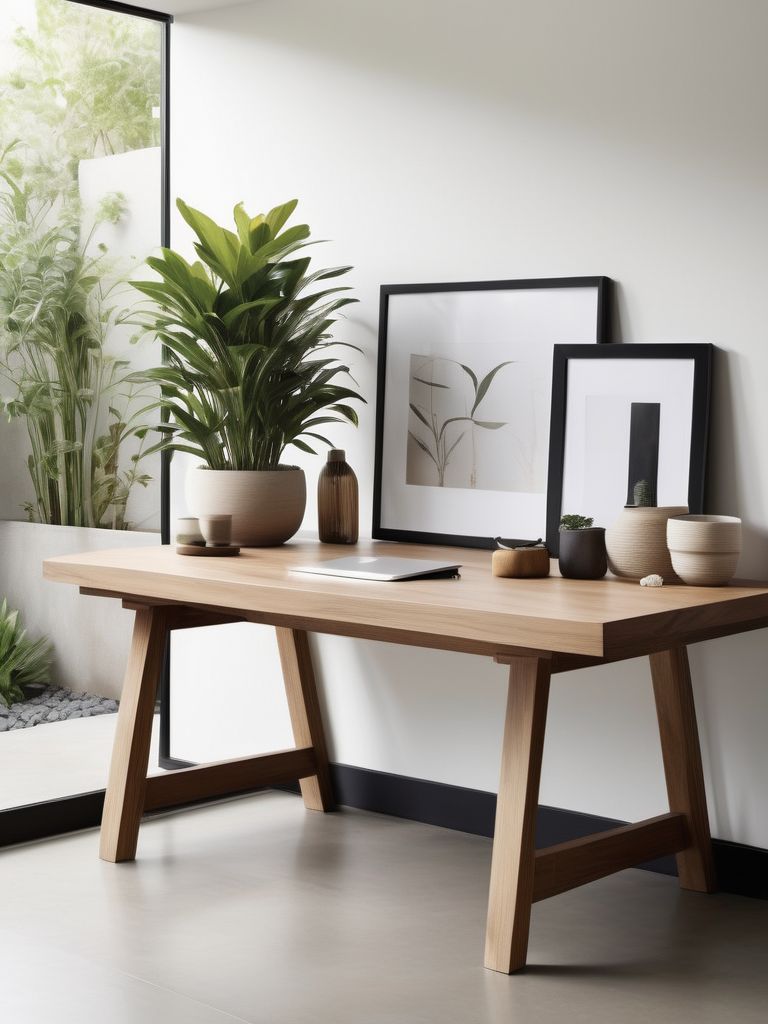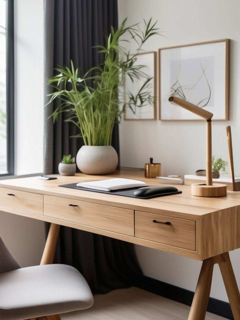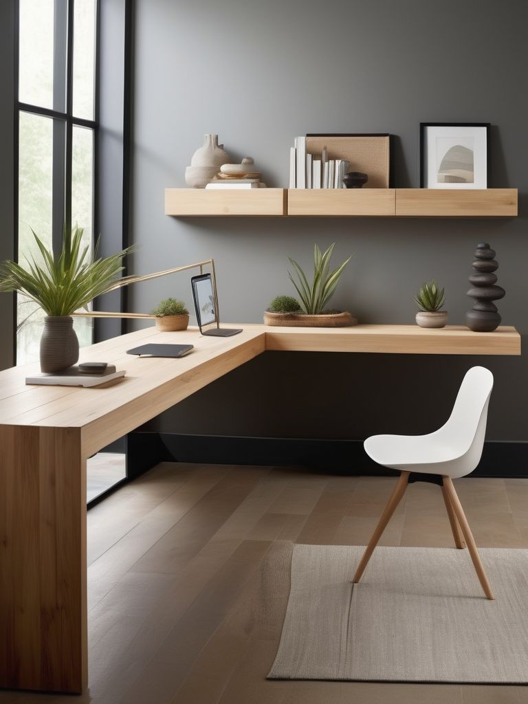 Minimalist desk, Ergonomic chair, Neutral-colored wall art, Natural wood shelving, Tabletop water fountainDescription
