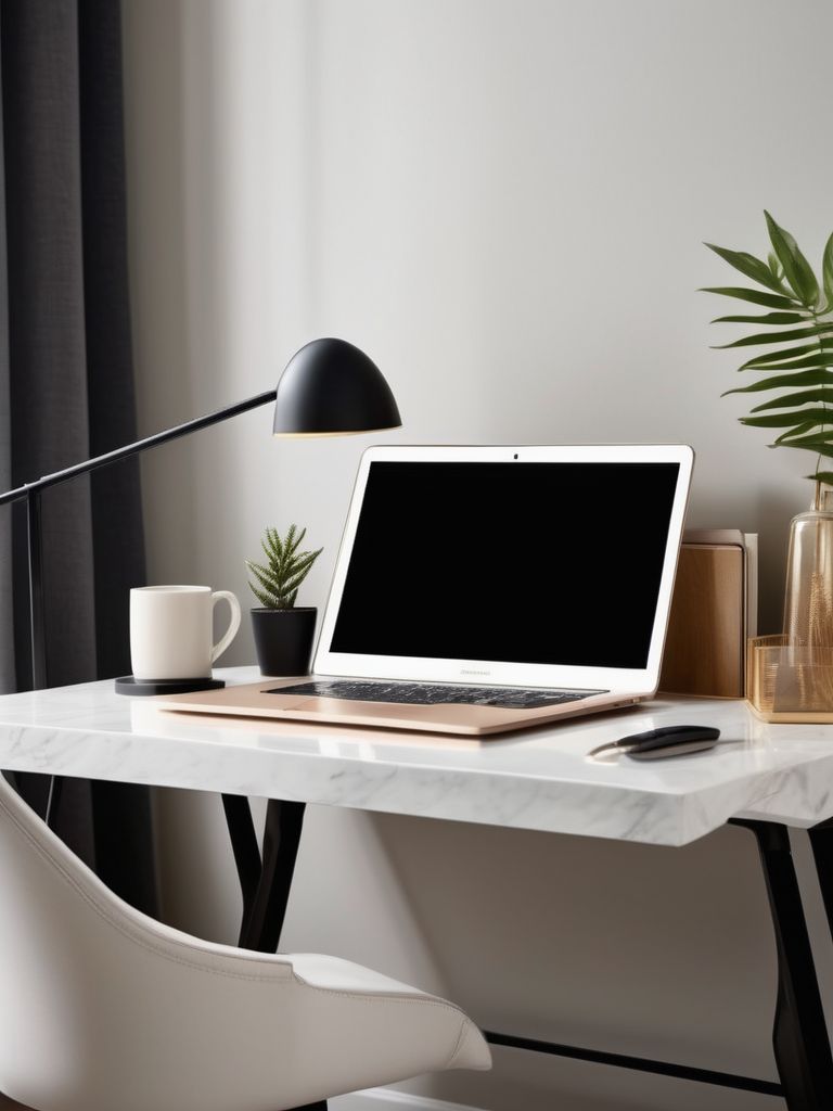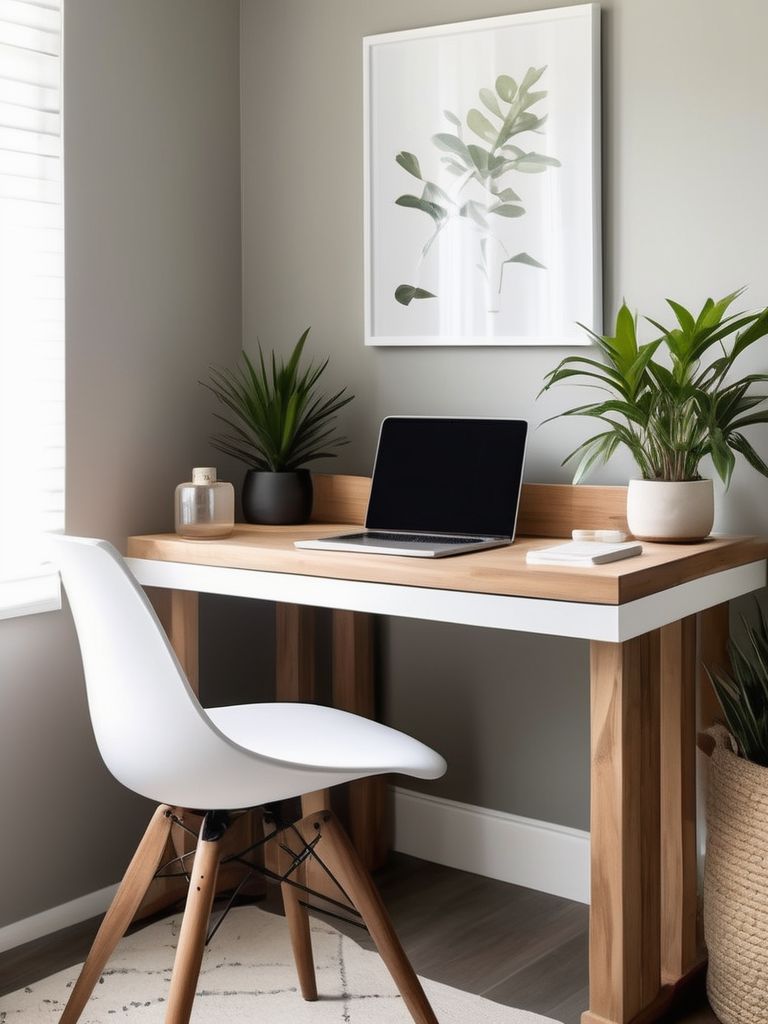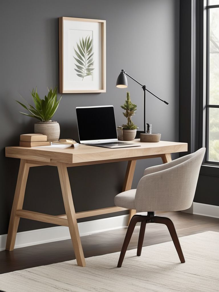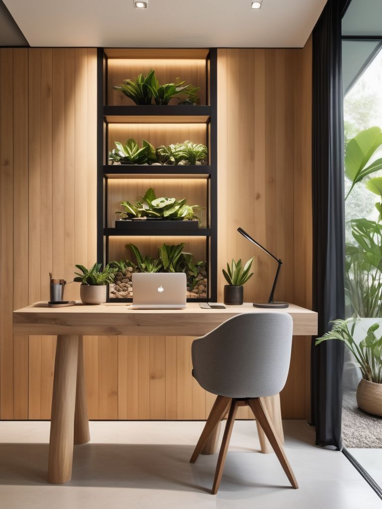 Minimalist desk, Ergonomic chair, Neutral-colored wall art, Natural wood shelving, Tabletop water fountainDescription