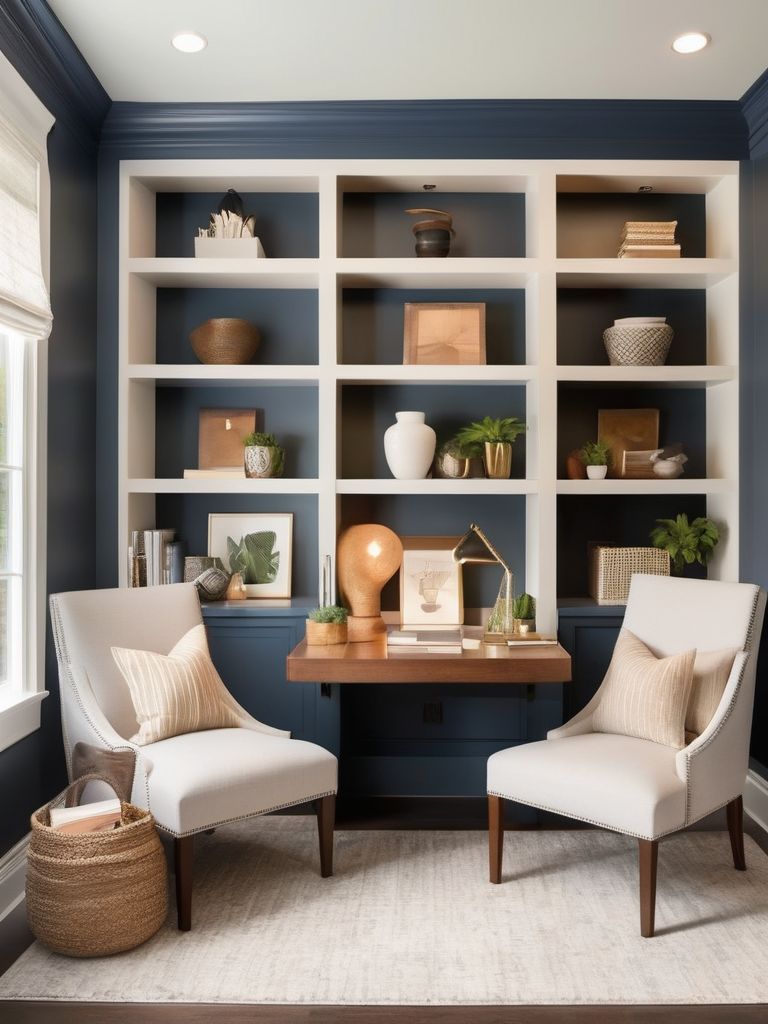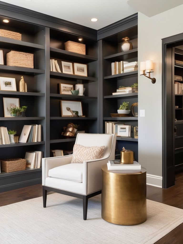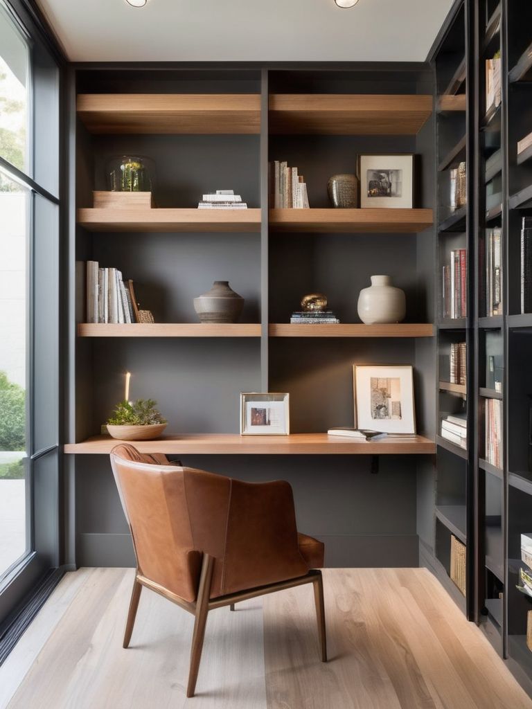 Create a home office library that seamlessly combines practicality and style with built-in bookshelves. Optimize the space for productivity and relaxation by designing a personalized reading nook within the shelving unit. Incorporate functional storage solutions and adjustable lighting to cater to different needs. Maintain a harmonious aesthetic by coordinating colors and materials with the existing decor.