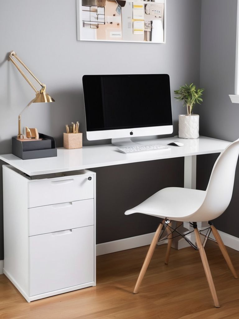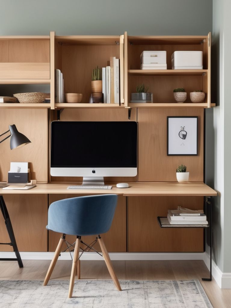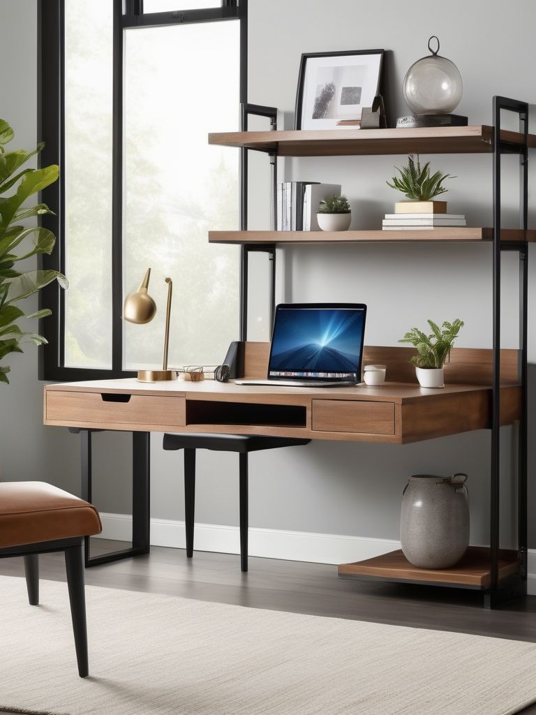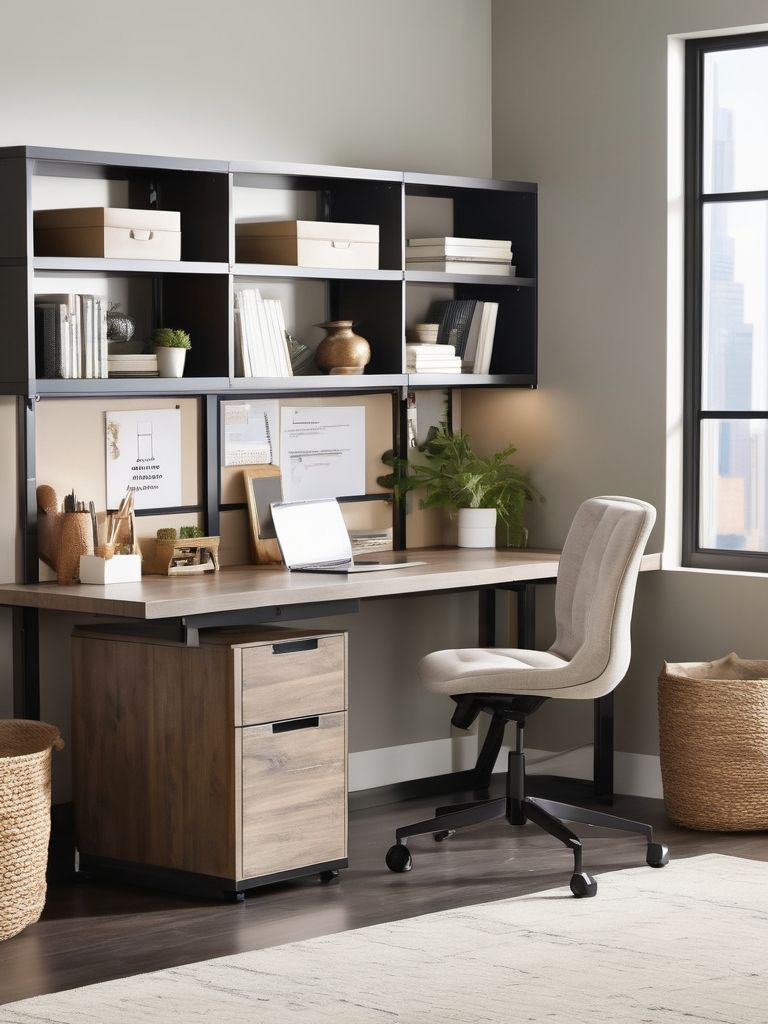 Modular desk, Shelving unit, Storage ottoman, Wall-mounted organizer, Ergonomic chair, Adjustable standing deskDescription