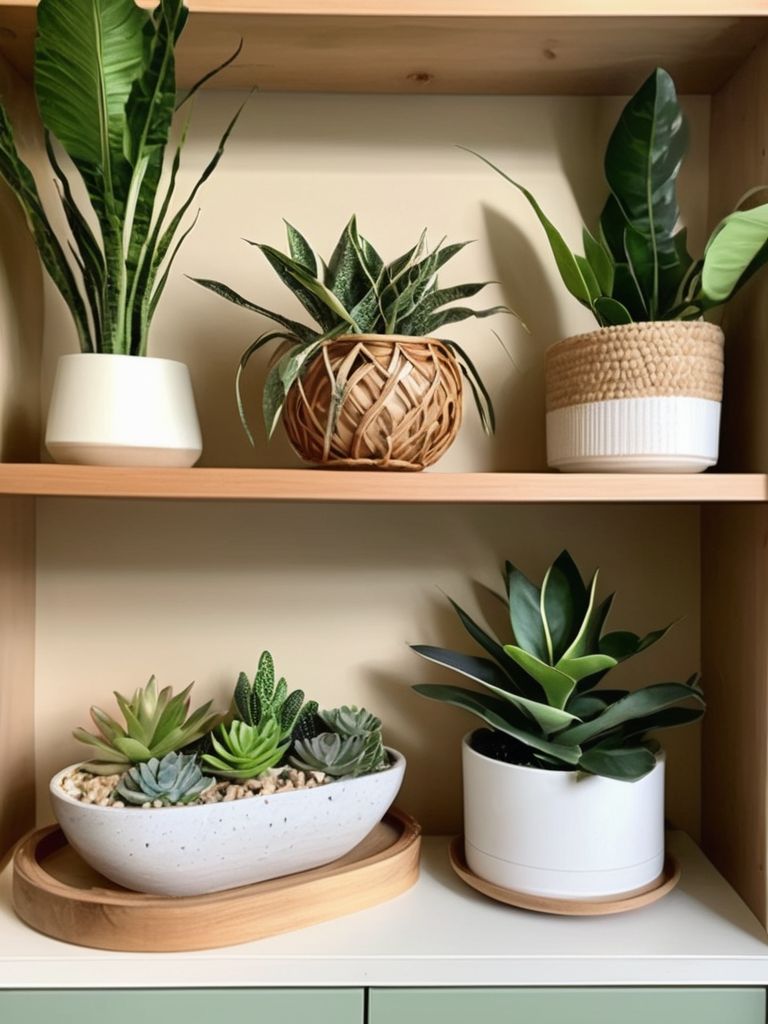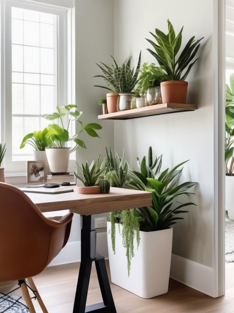 To create a calming home office oasis with plant decor and biophilic design, first, select low-maintenance plants such as snake plants, pothos, or peace lilies to bring greenery into the space. Incorporate natural materials like wood and stone for a grounding effect, and add elements like a small tabletop fountain or a nature-inspired mural to enhance the biophilic design. Lastly, ensure ample natural light and consider incorporating ergonomic furniture to promote a productive and serene work environment.