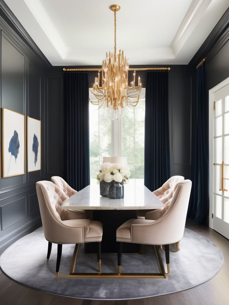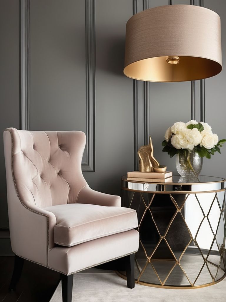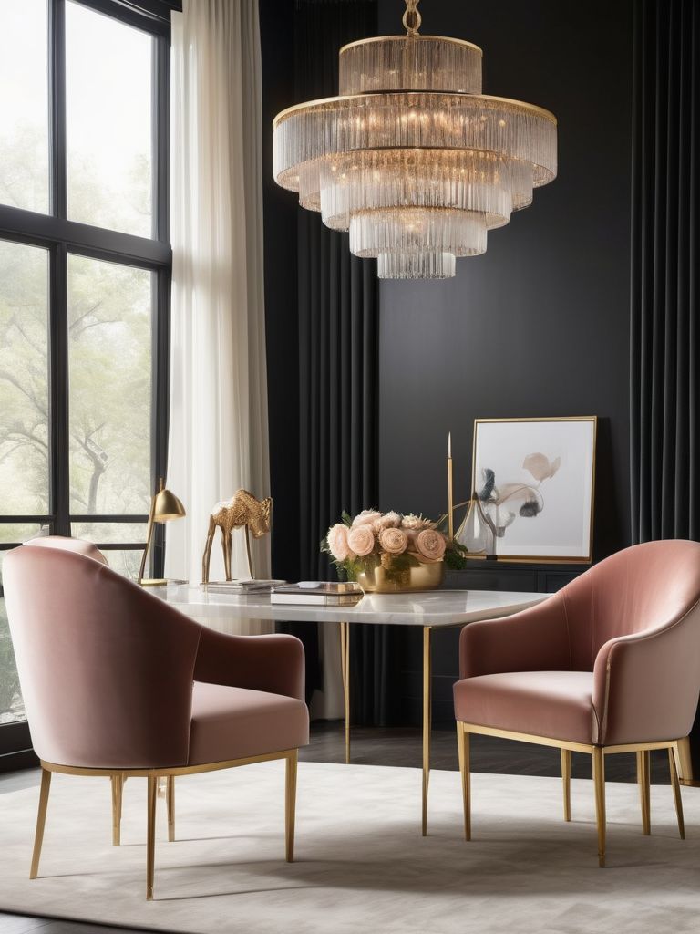 Velvet chair, Velvet drapes, Chandelier, Modern pendant lights, Elegant desk accessoriesDescription
