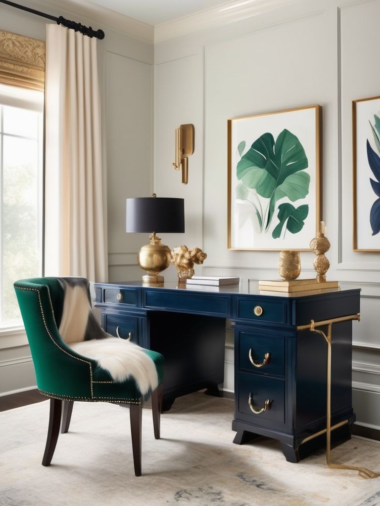 Create a home office space that exudes elegance and sophistication. Opt for a sophisticated color palette of soft neutrals and deep jewel tones, and complement it with luxurious textiles such as velvet and silk. Incorporate antique finds like a vintage desk or ornate drawer pulls to add character and charm. Embrace a blend of modern convenience and timeless beauty, and elevate your work environment with a touch of elegance.