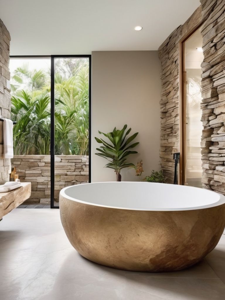 Natural stone tiles, Natural stone countertops, Wooden accents, Live plants, Neutral colored bathroom accessoriesDescription
