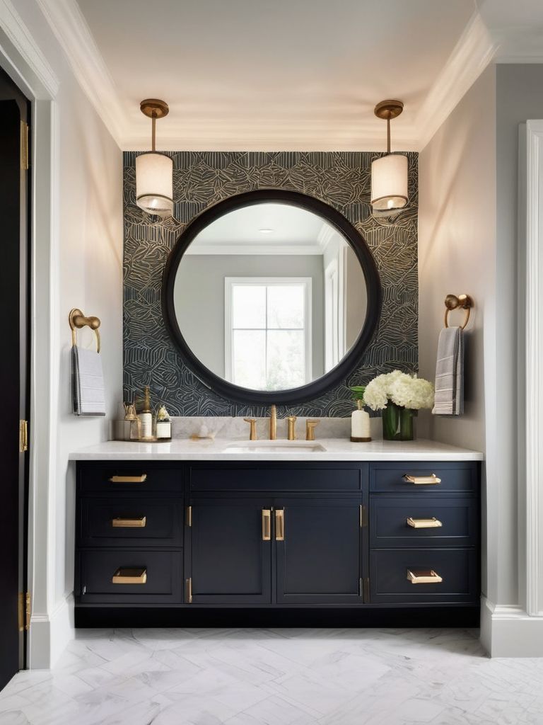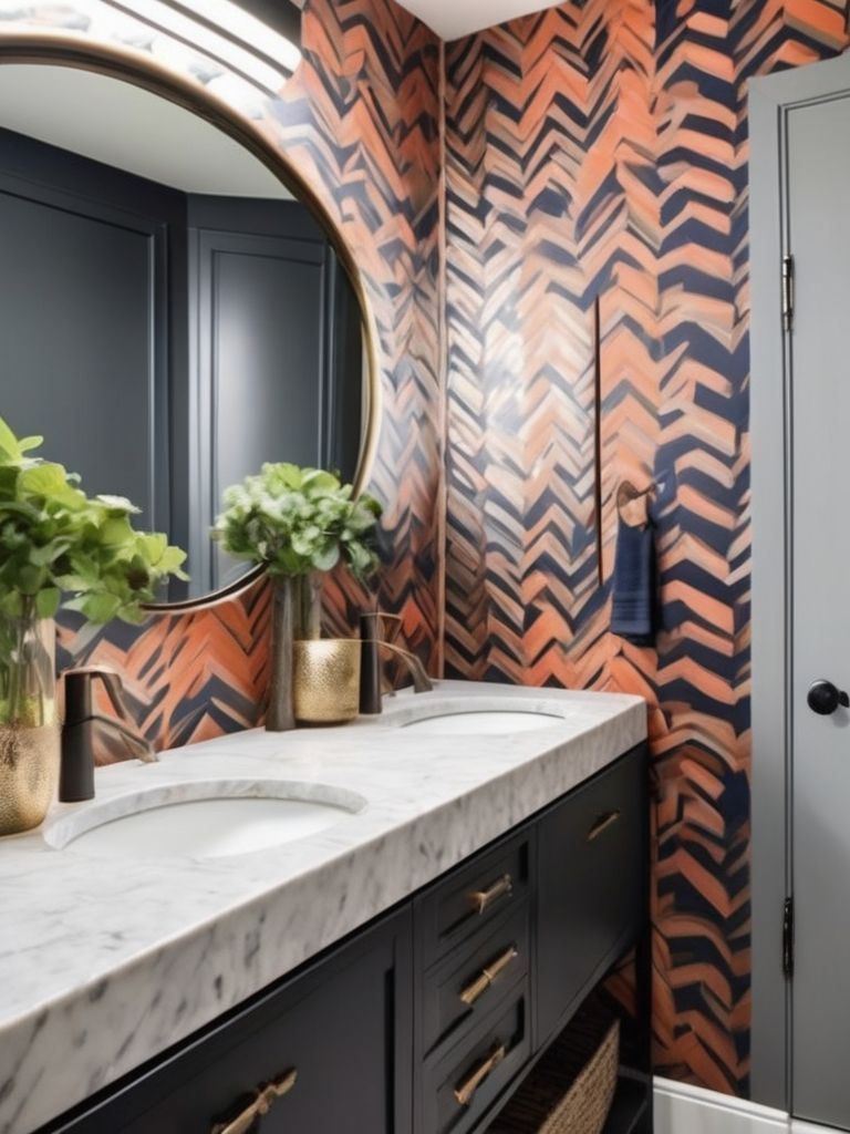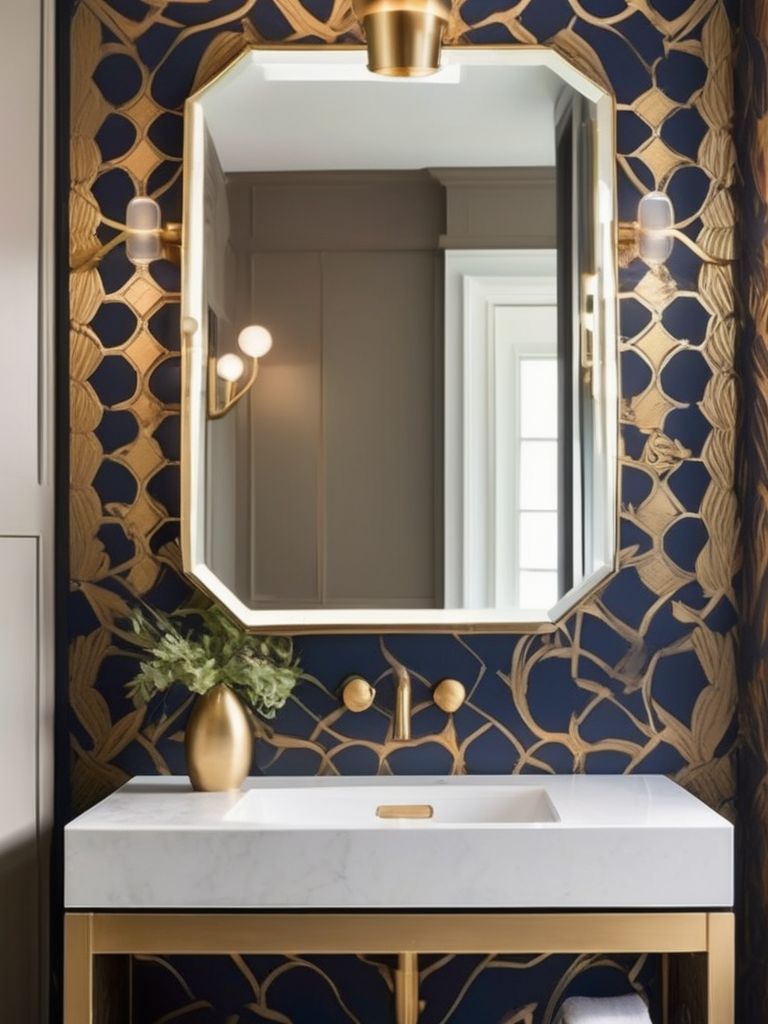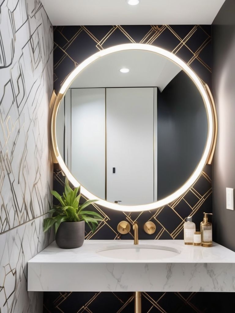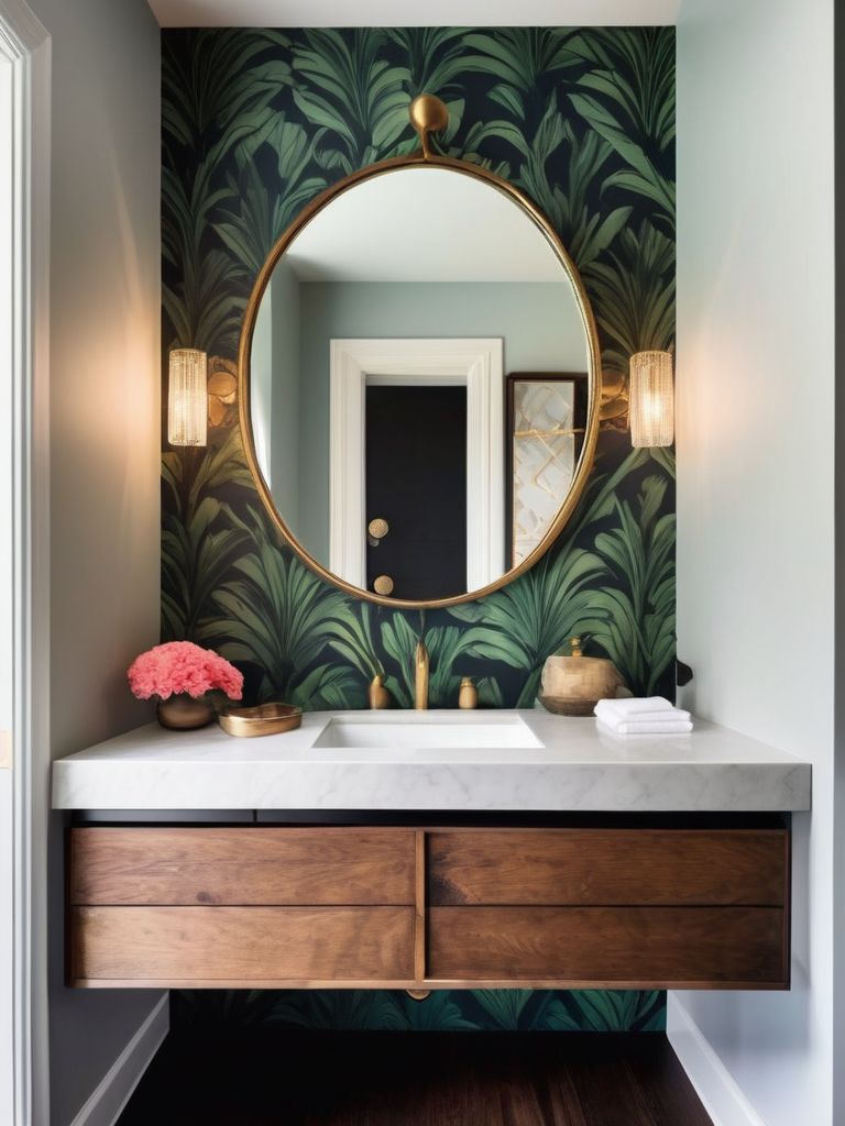 Bold and adventurous wallpaper, Statement mirrors, Vibrant patterns or large-scale designs, Unique and stylish mirrors, Minimalist fixturesDescription