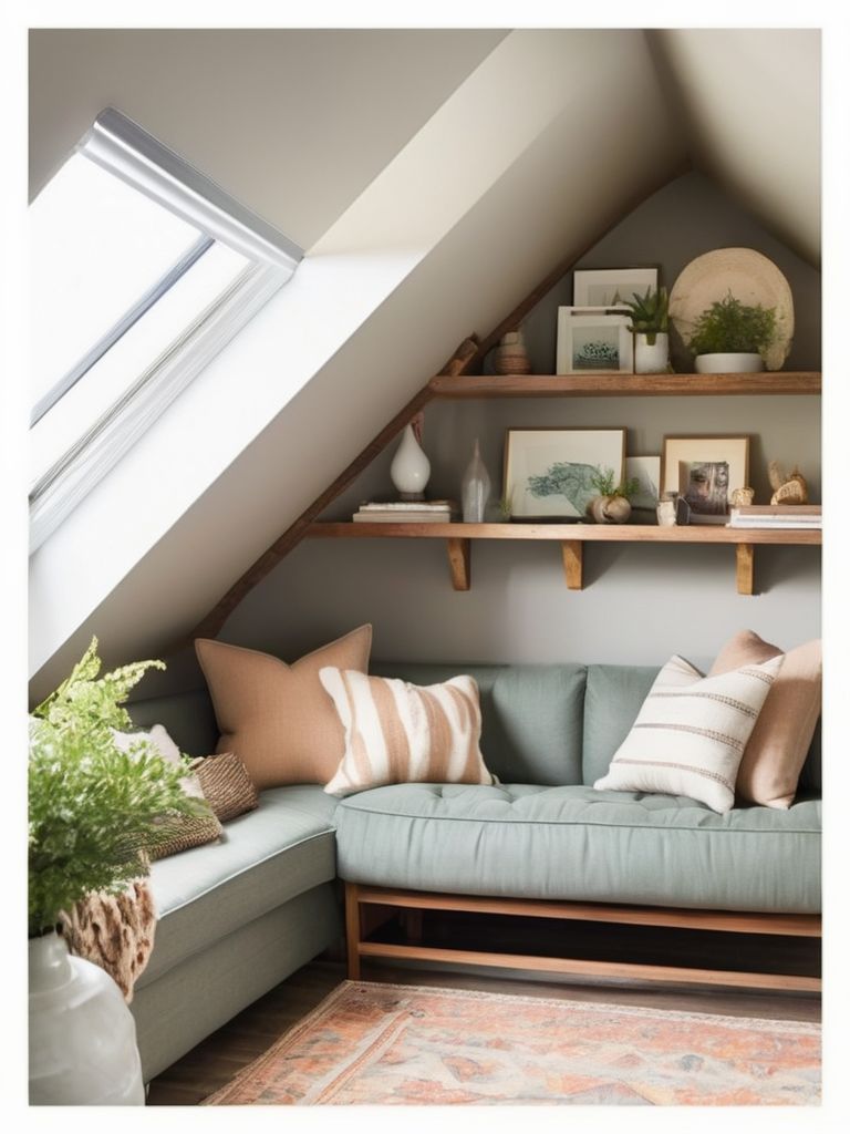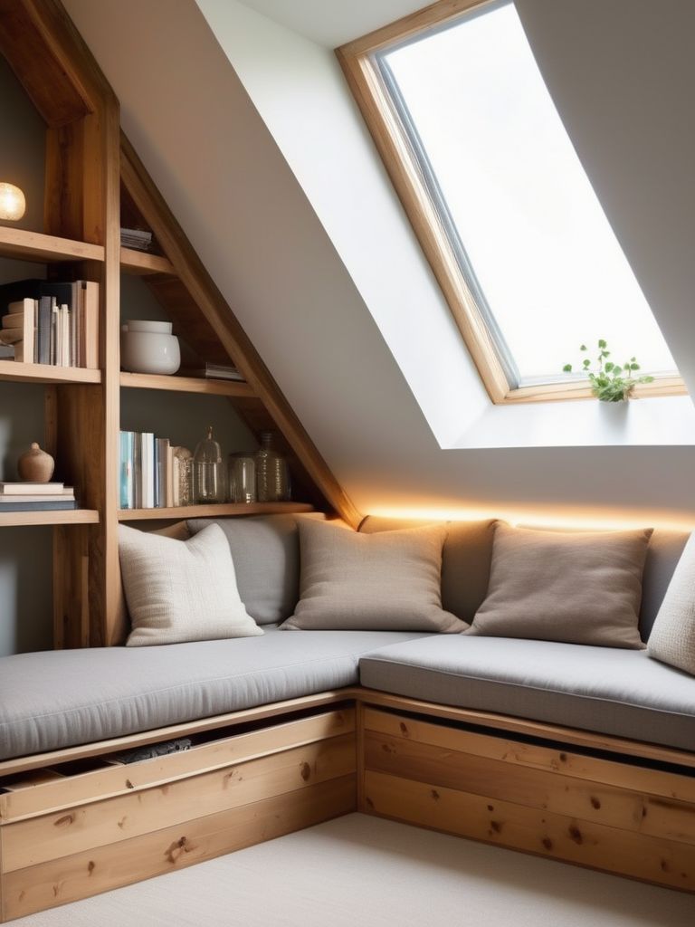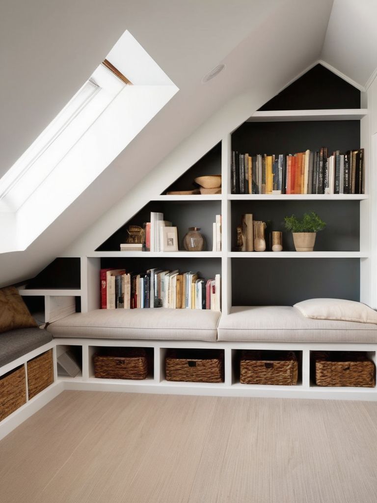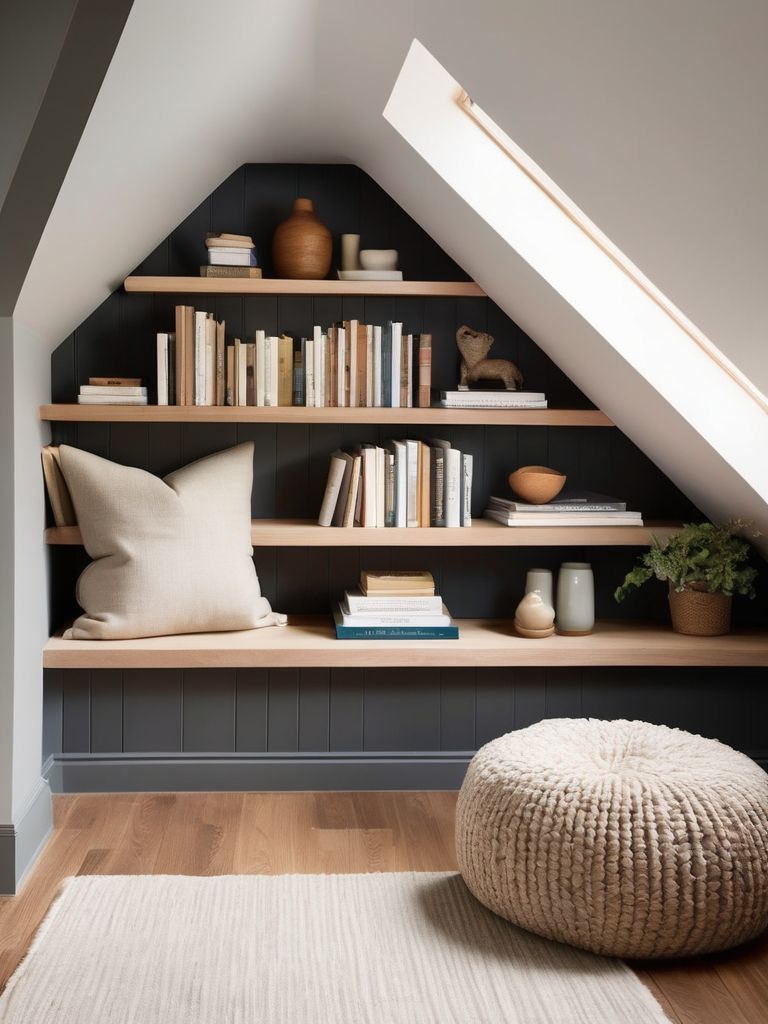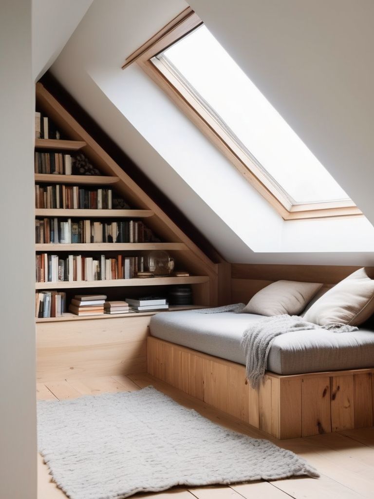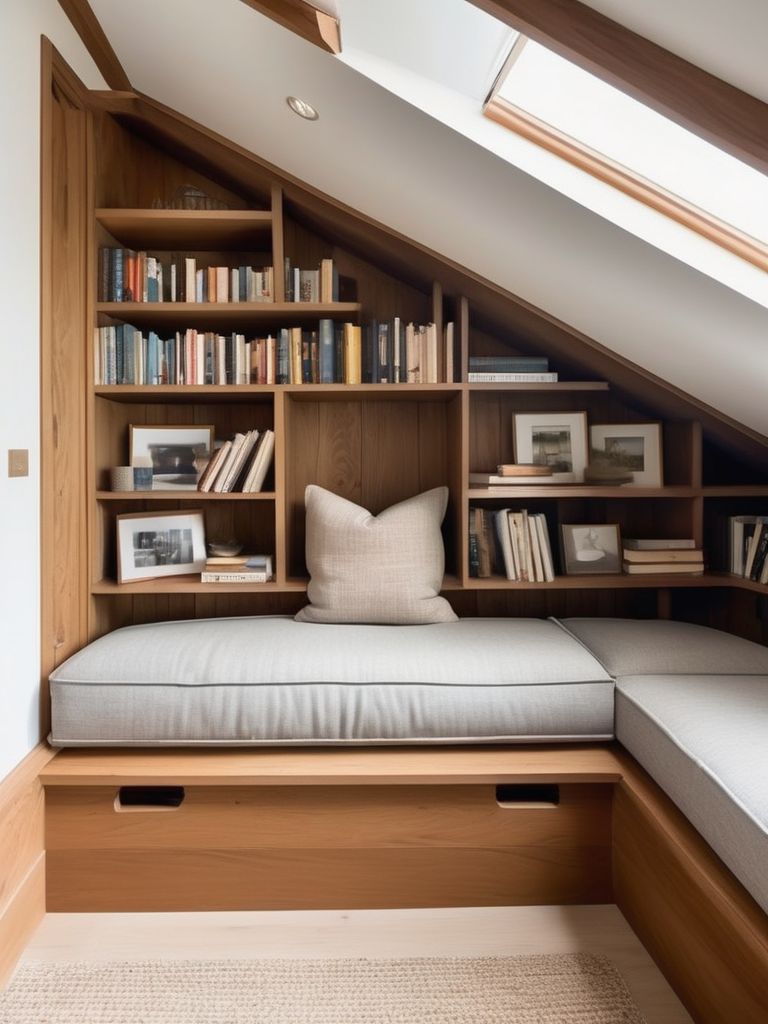 Transform Your Attic into a Cozy Reading Retreat with Built-in Bookshelves and Serene Ambiance