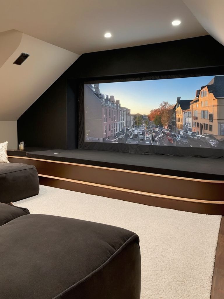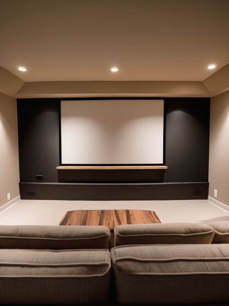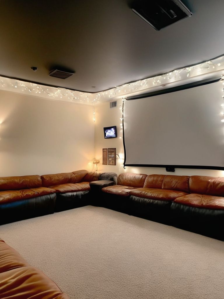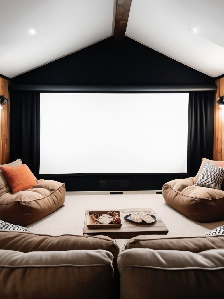 High-quality projector screen, Surround sound system, Bean bags or plush floor cushions, Soft ambient lighting, Decorative curtainsDescription