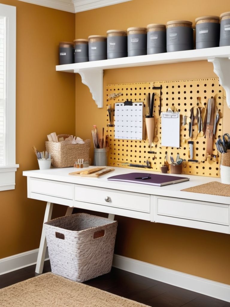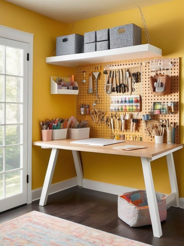 Pegboard organizers, Versatile work surfaces, Ample lighting, Thoughtful decor, Comfortable seatingDescription