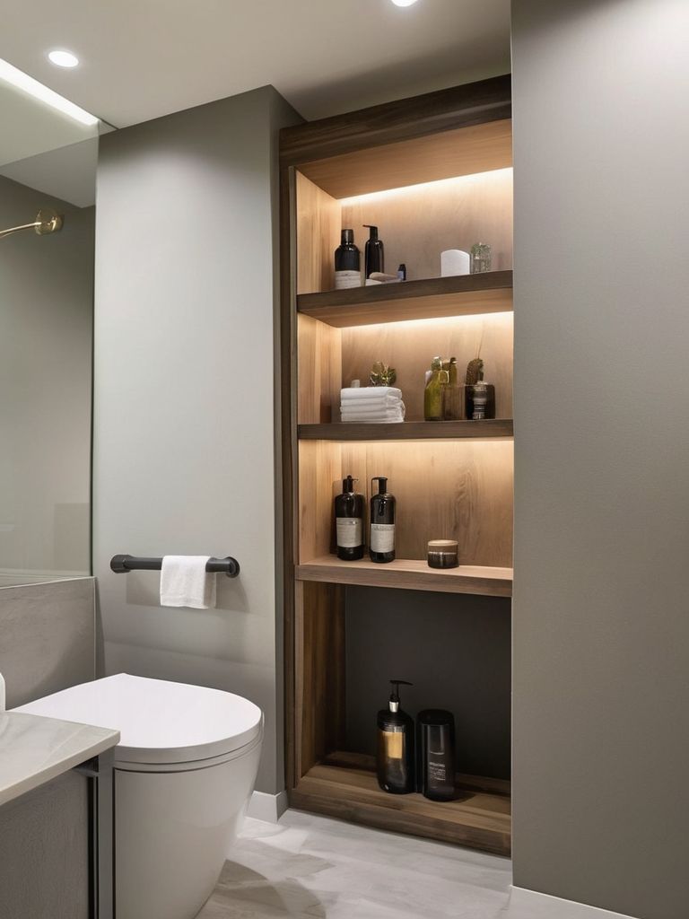 Maximize bathroom functionality with the addition of recessed shelving to provide smart storage solutions. Incorporate custom-built recessed shelves into the walls to save space and offer a sleek, seamless appearance. Use the shelves to store everyday essentials, decorative items, and towels, while adding a practical yet stylish element to your bathroom. This design choice not only enhances the functionality of the space but also adds a modern and minimalist touch to the overall decor.