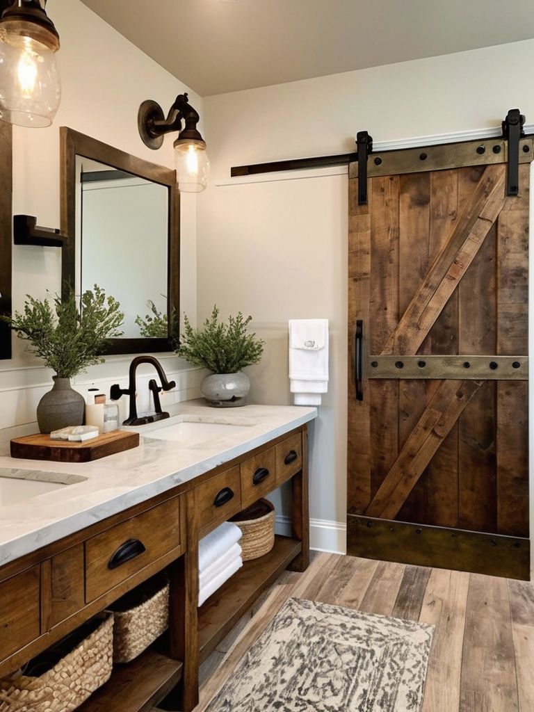 Transform Your Bathroom into a Rustic Haven with Barn Doors and Stone Sinks for Vintage Charm and Cozy Ambience