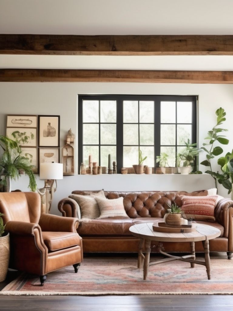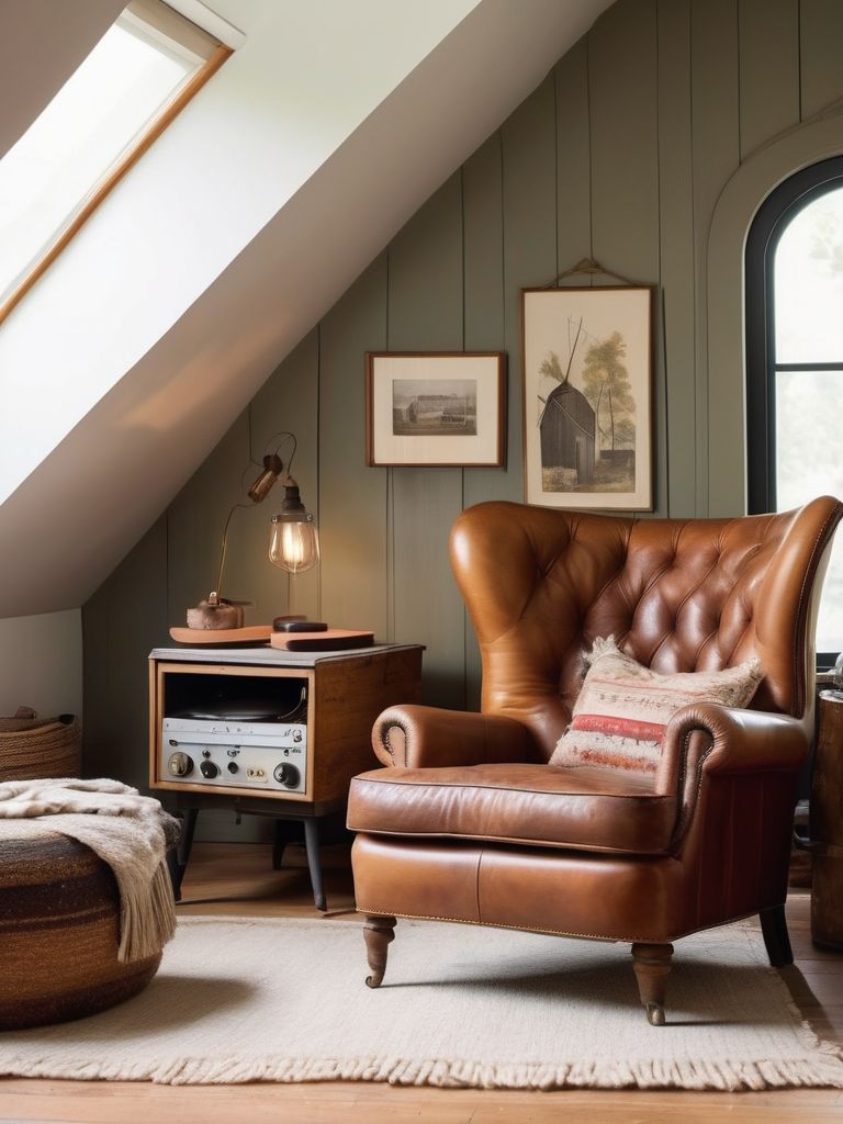Distressed leather armchair, Weathered wooden coffee table, Vintage rugs, Old-fashioned lighting fixtures, Decorative accentsDescription