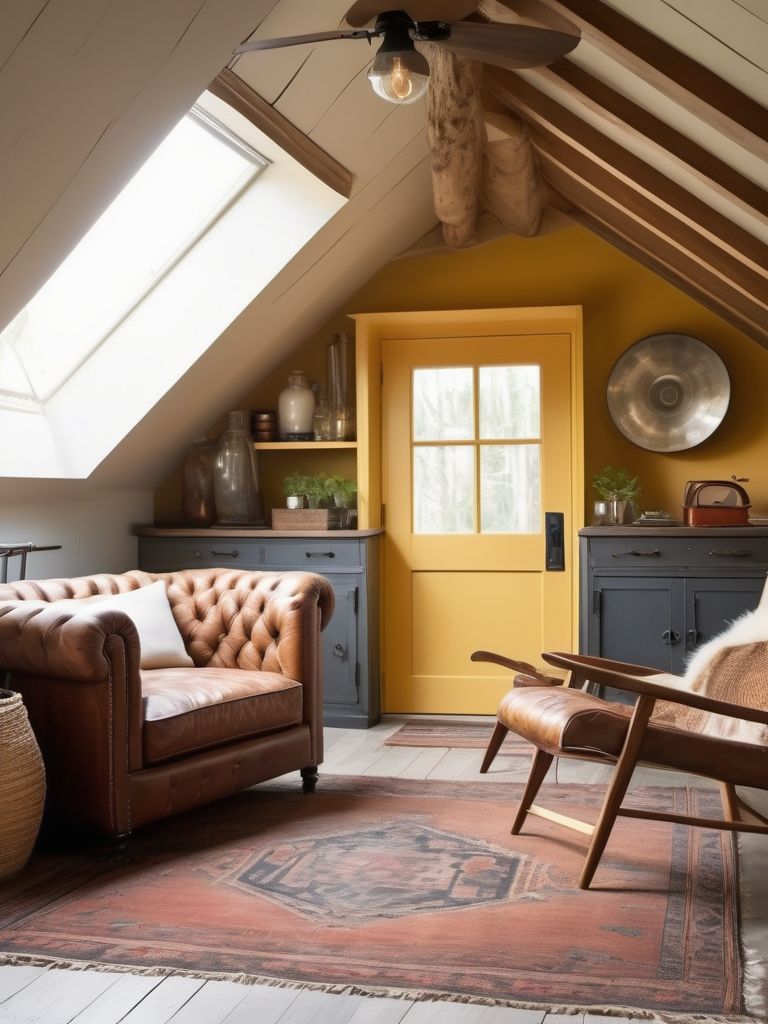 Create a cozy and inviting attic space with vintage charm by incorporating antique furniture and retro accessories. Embrace the unique character and history of each piece, such as a distressed leather armchair or a weathered wooden coffee table. Add warmth and nostalgia with vintage rugs, old-fashioned lighting fixtures, and decorative accents. Emphasize the eclectic mix of textures, patterns, and colors to create a one-of-a-kind vintage retreat that exudes comfort and style.