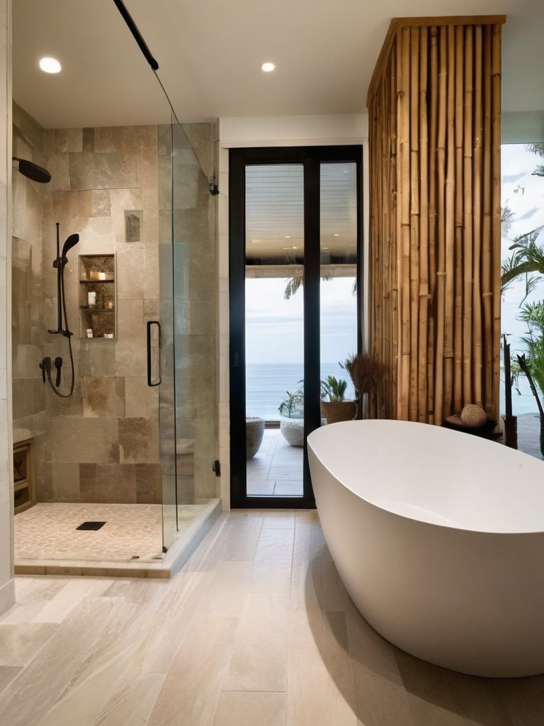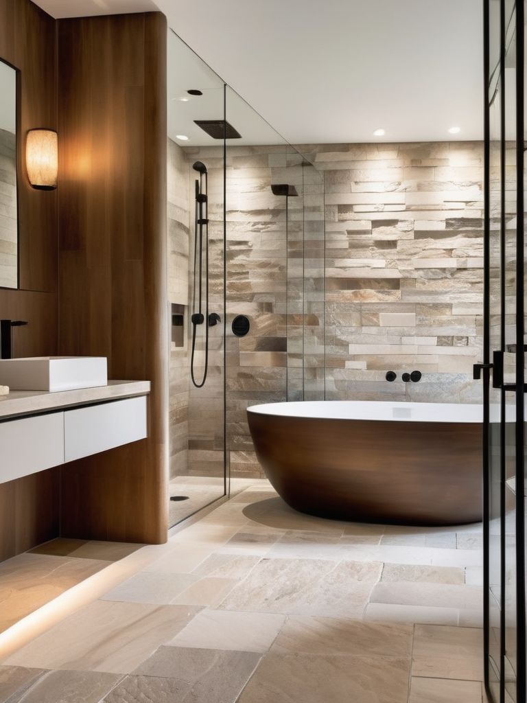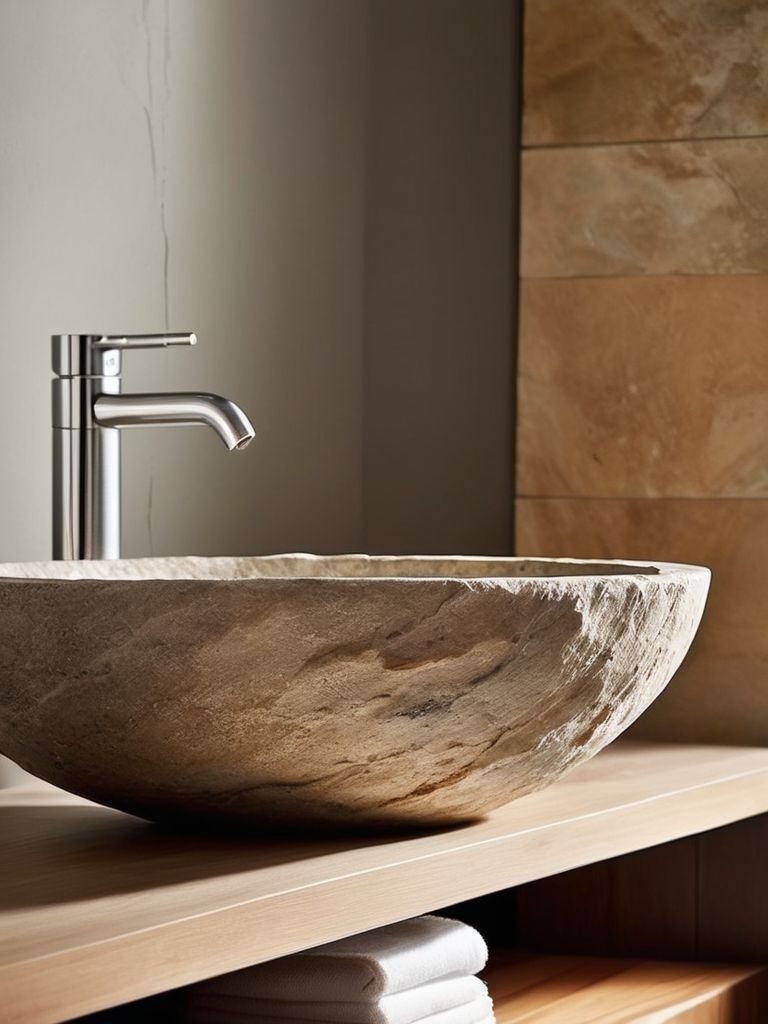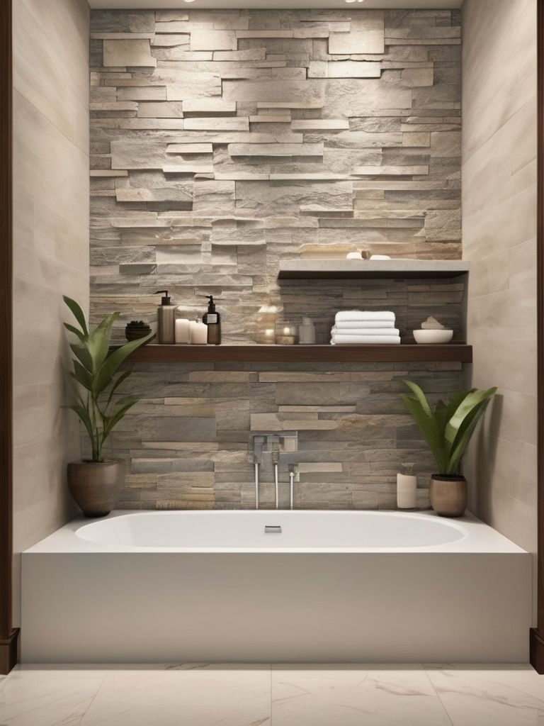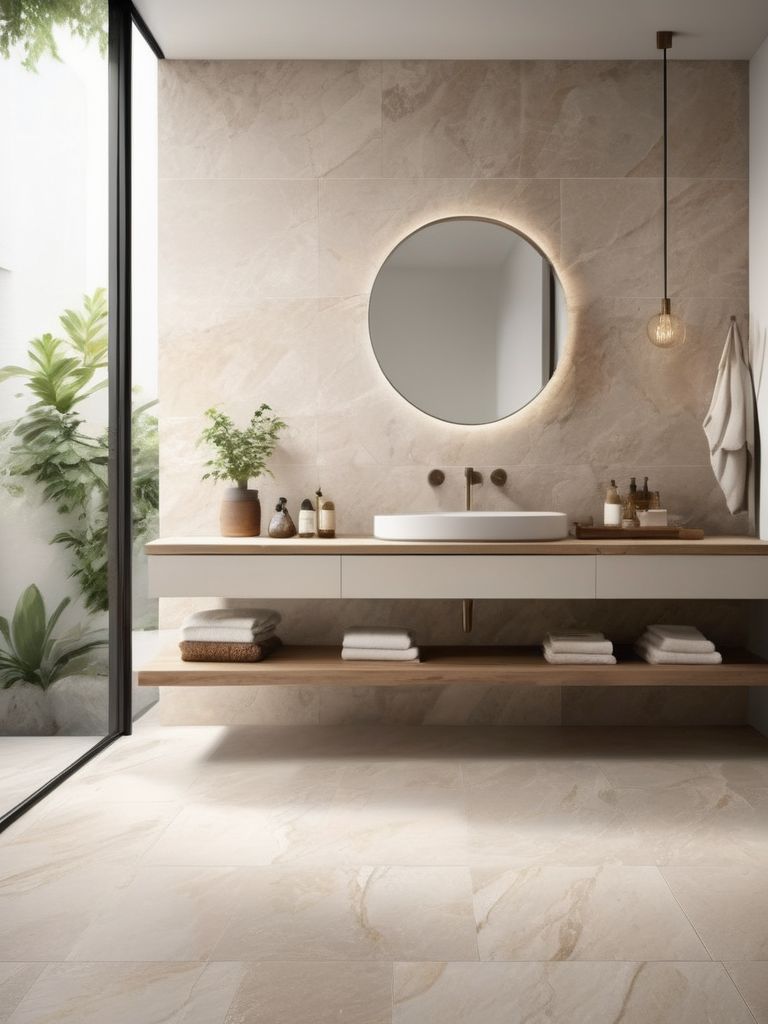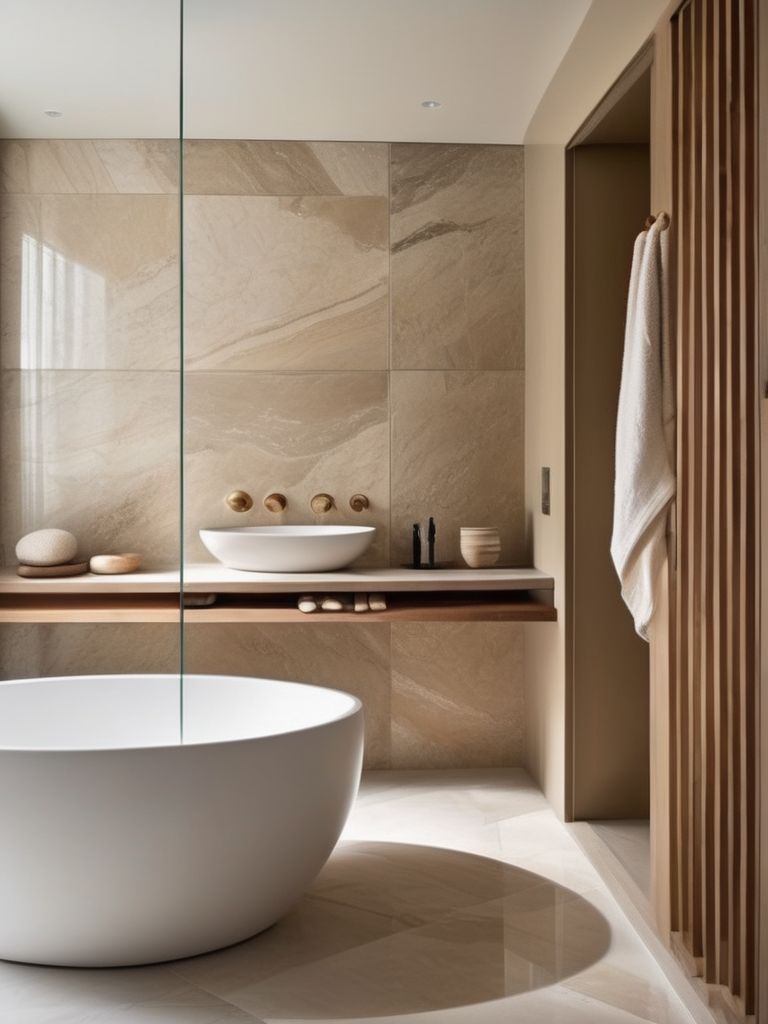 Natural stone tiles, Minimalist fixtures, Neutral color palette, Greenery, Design-focused accessoriesDescription