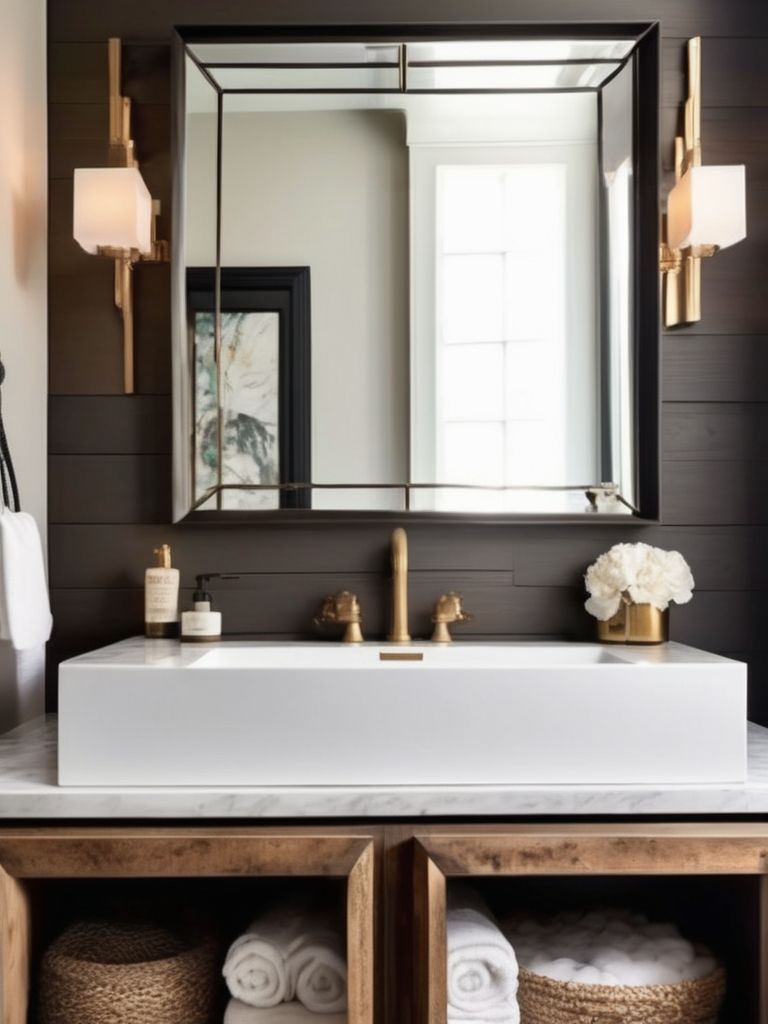 Oversized mirror, Patterned area rug, Velvet throw pillows, Faux fur throw blanket, Leather accent chairDescription