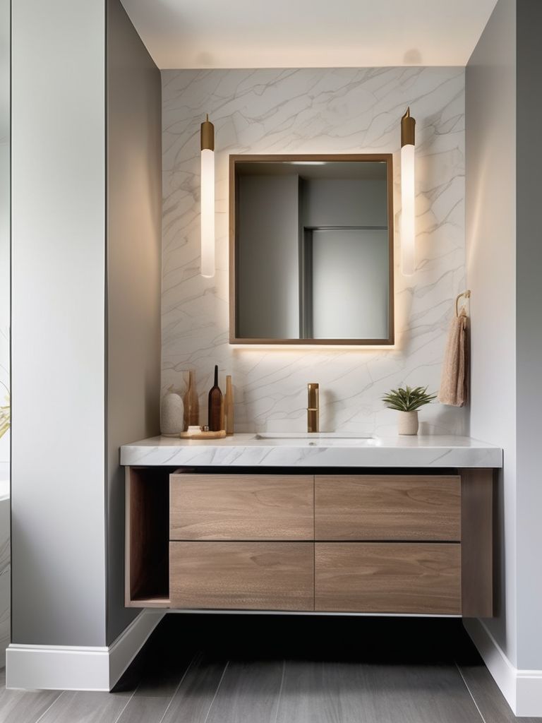 Floating vanities, Marble, Quartz, Wood, LED lightingDescription