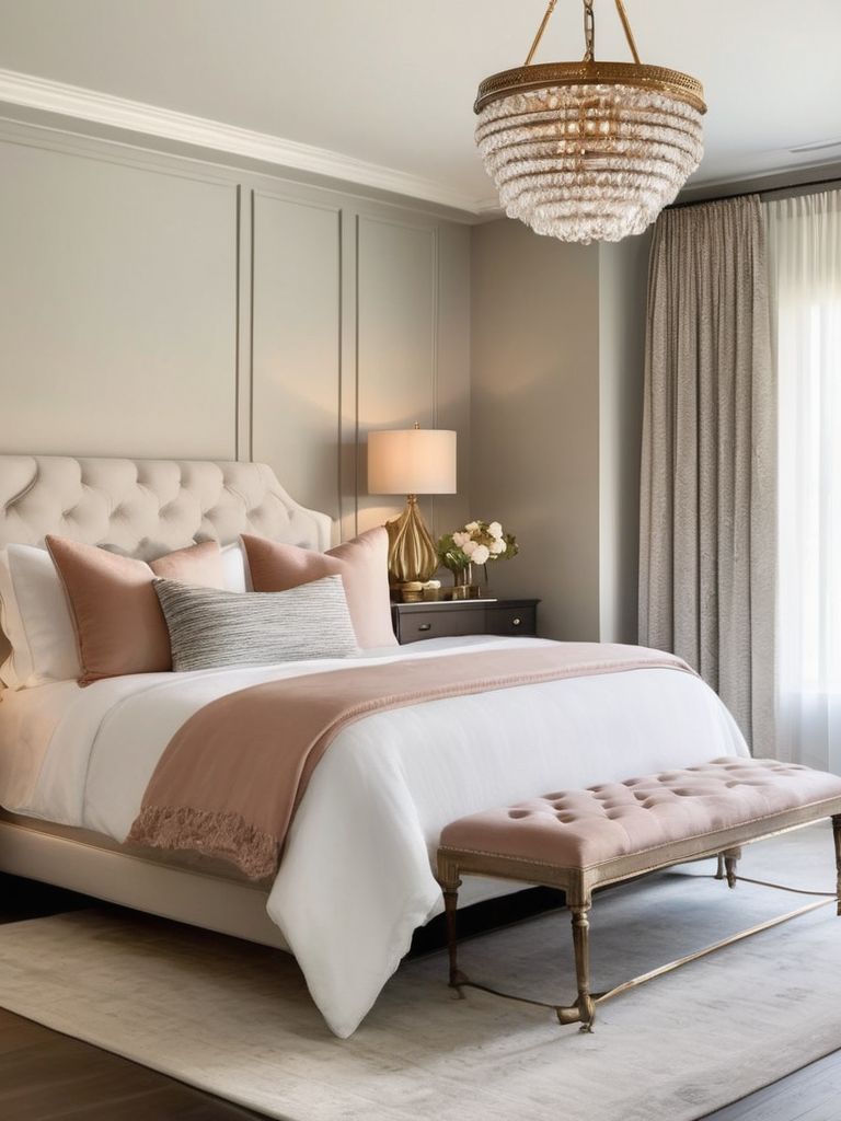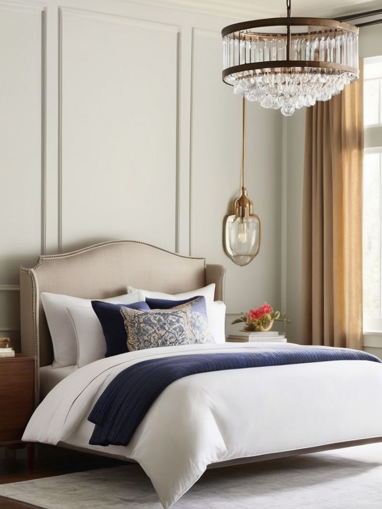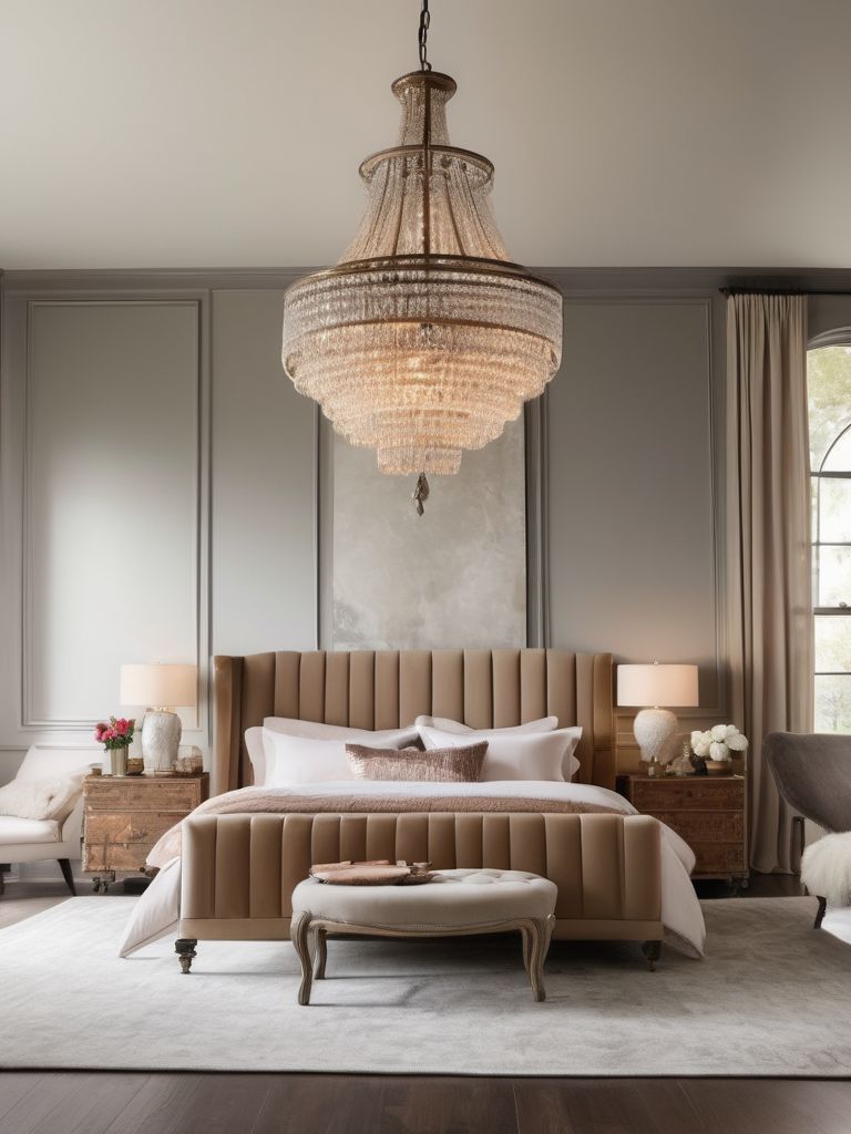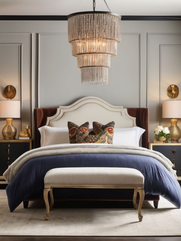 Antique bed frame, Contemporary chandelier, Muted tone bedding, Velvet or silk throw pillows, Statement art piecesDescription