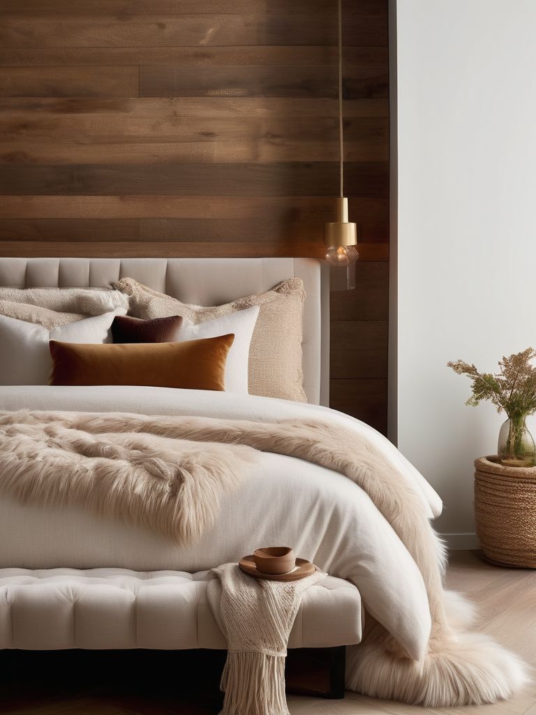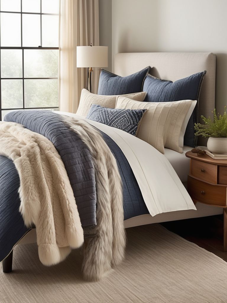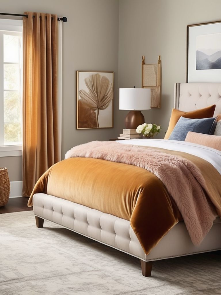 Velvet throw blanket, Faux fur accent pillows, Linen upholstered headboard, Plush velvet curtains, Textured area rugDescription