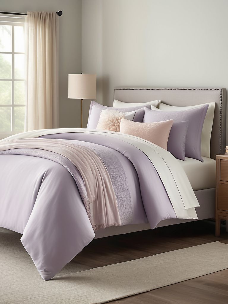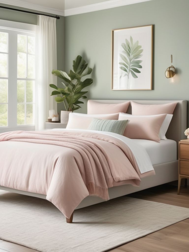Blush pink bedding set, Mint green throw pillows, Light lavender curtains, Botanical artwork, Potted plantsDescription