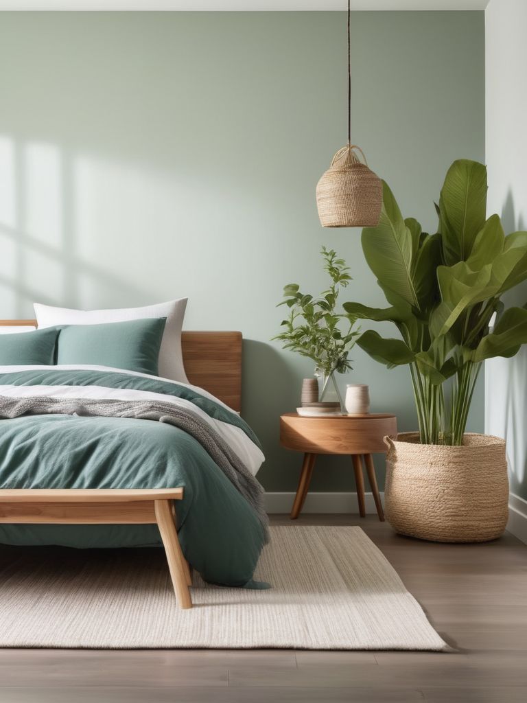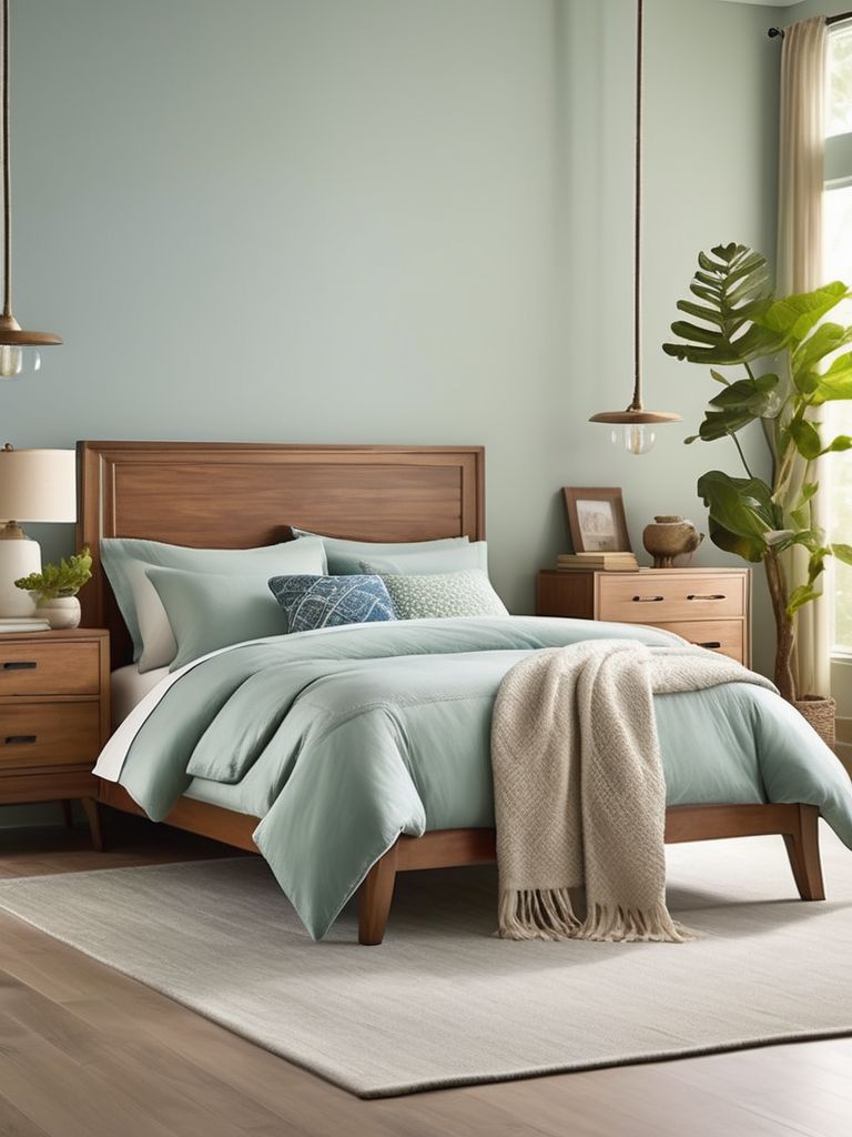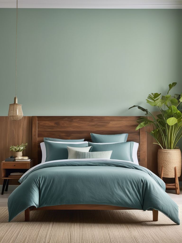 Blue wall paint, Green bedding, Accent decor in calming hues, Indoor plants, Wooden furnitureDescription
