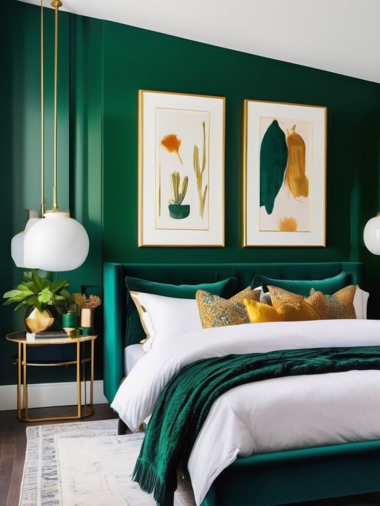Emerald green paint, Royal blue bedding, Mustard yellow accent pillows, Colorful area rug, Patterned curtainsDescription