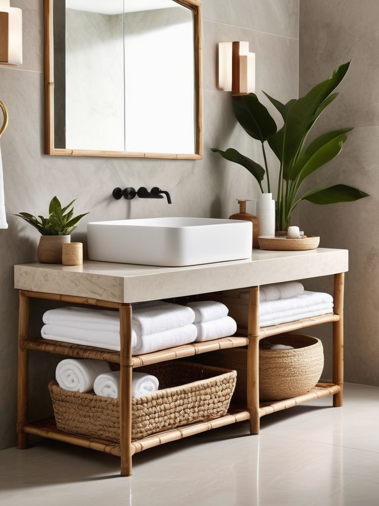 Stone bathroom accessories, Bamboo bath accessories, Rattan storage baskets, Earthy tone towels and bathmats, Organic cotton bath linensDescription