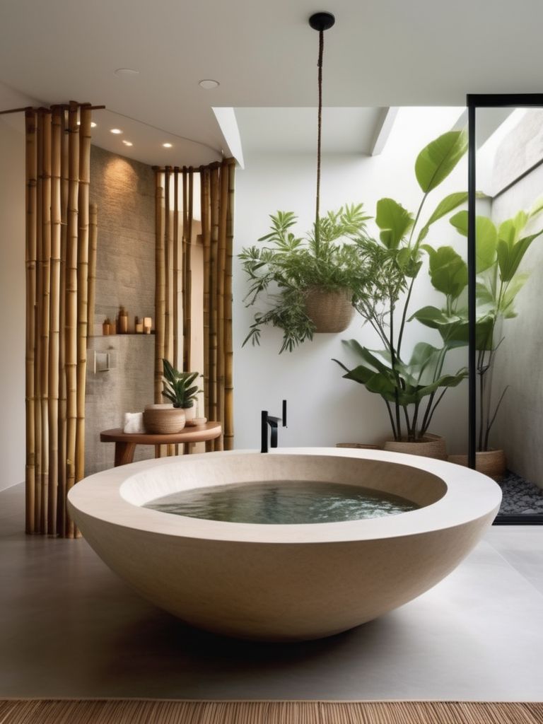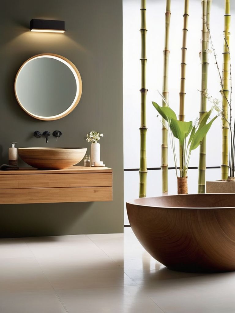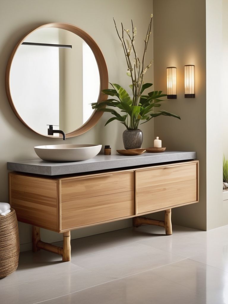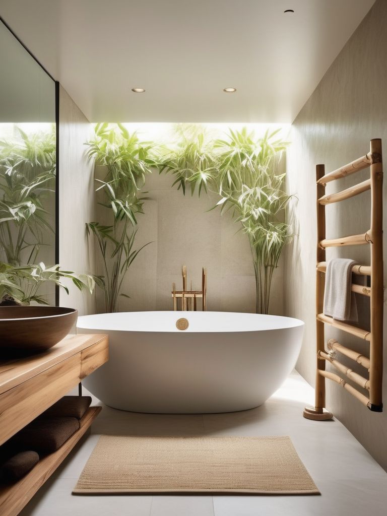 Japanese soaking tub, Bamboo bathroom accessories, Stone tiles, Minimalist vanity, Soft lighting optionsDescription