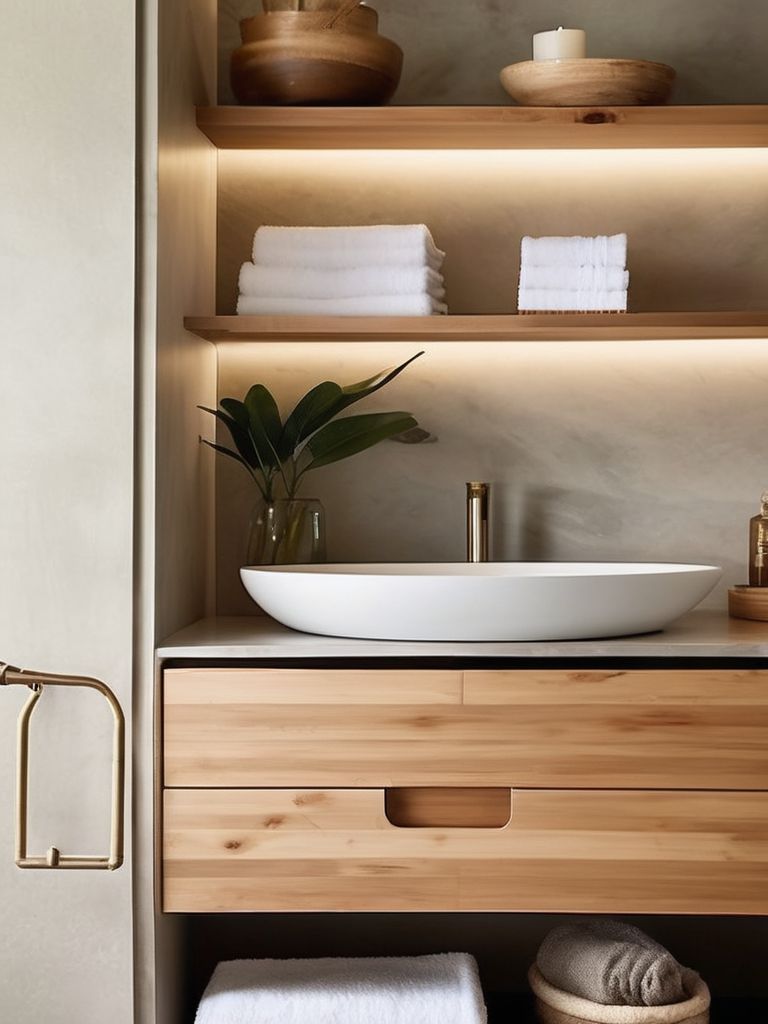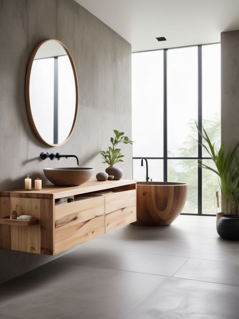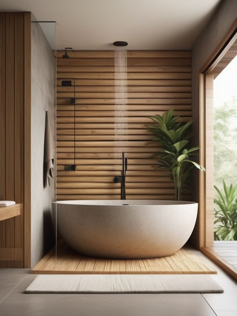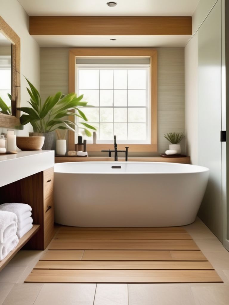 Japanese soaking tub, Bamboo bathroom accessories, Stone tiles, Minimalist vanity, Soft lighting optionsDescription