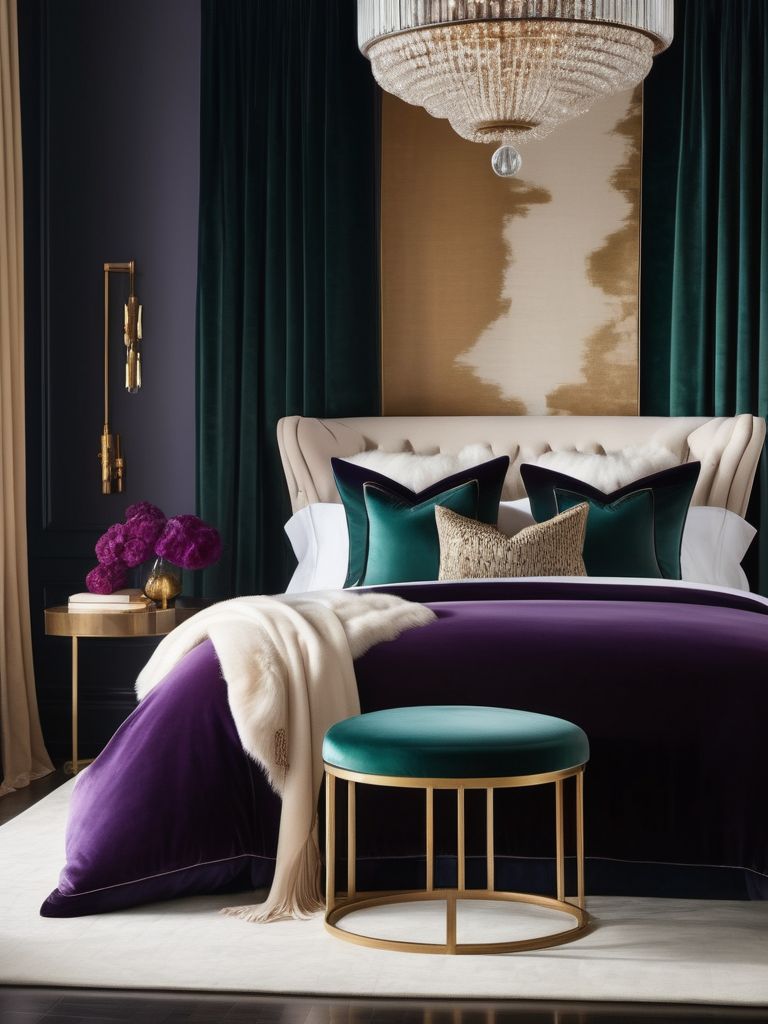 Velvet bedding, Silk drapery, Jewel tone throw pillows, Chandelier, Modern pendant lightDescription