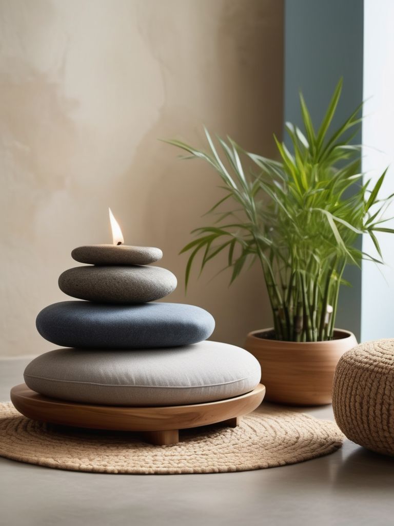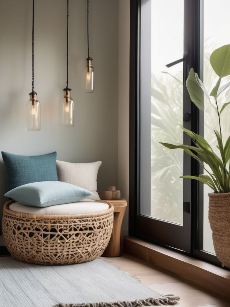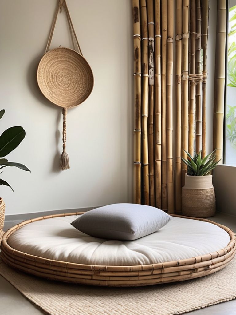 Bamboo or rattan furniture, Relaxing fountain, Mini Zen garden, Potted plants, Natural wood accentsDescription