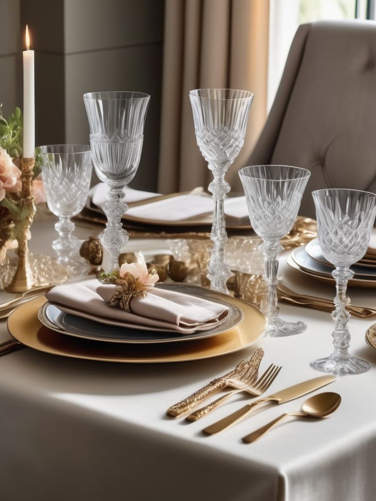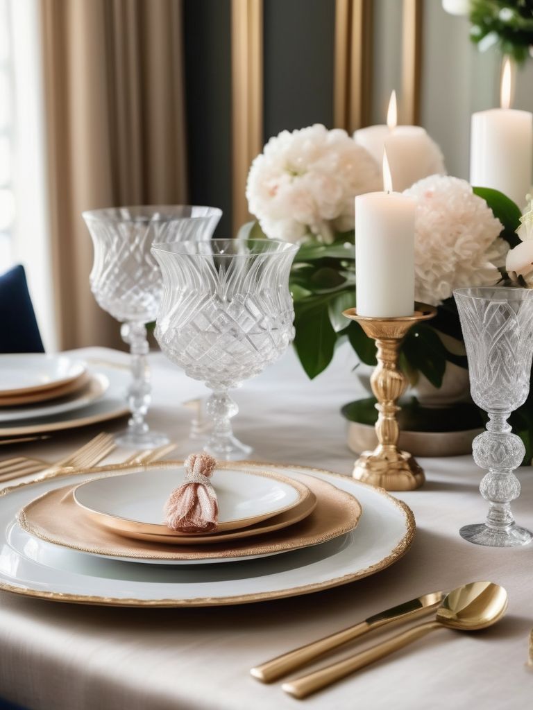 High-end table linens, Elegant dinnerware, Sophisticated glassware, Crystal candle holders, Fresh floral arrangementsDescription