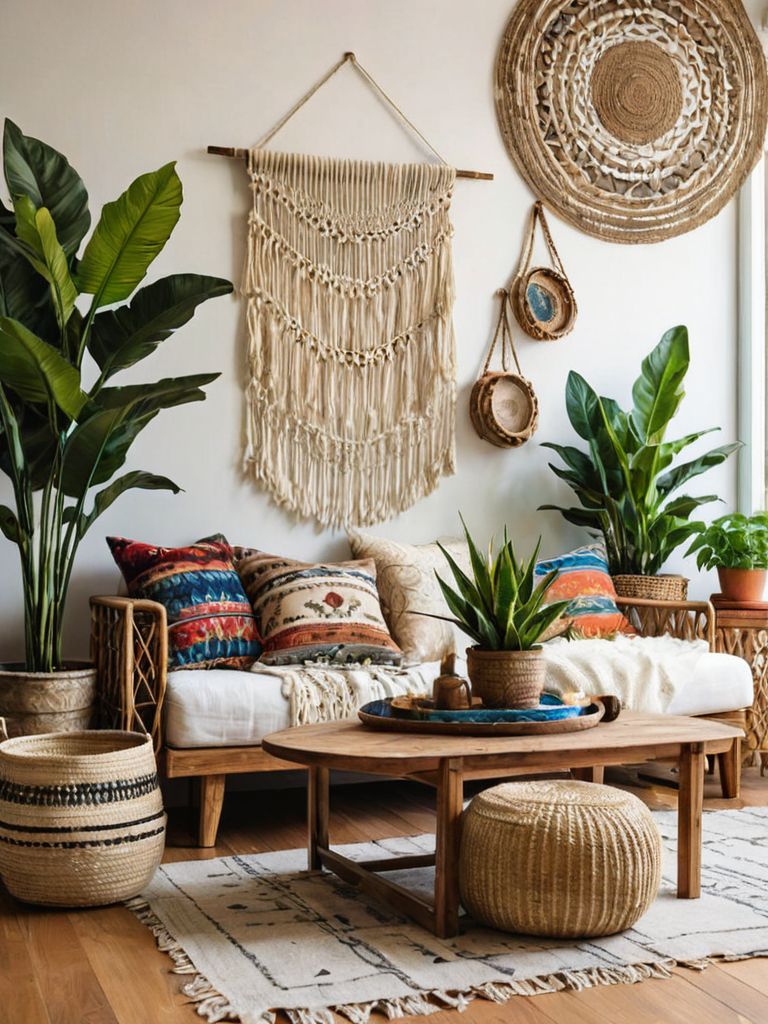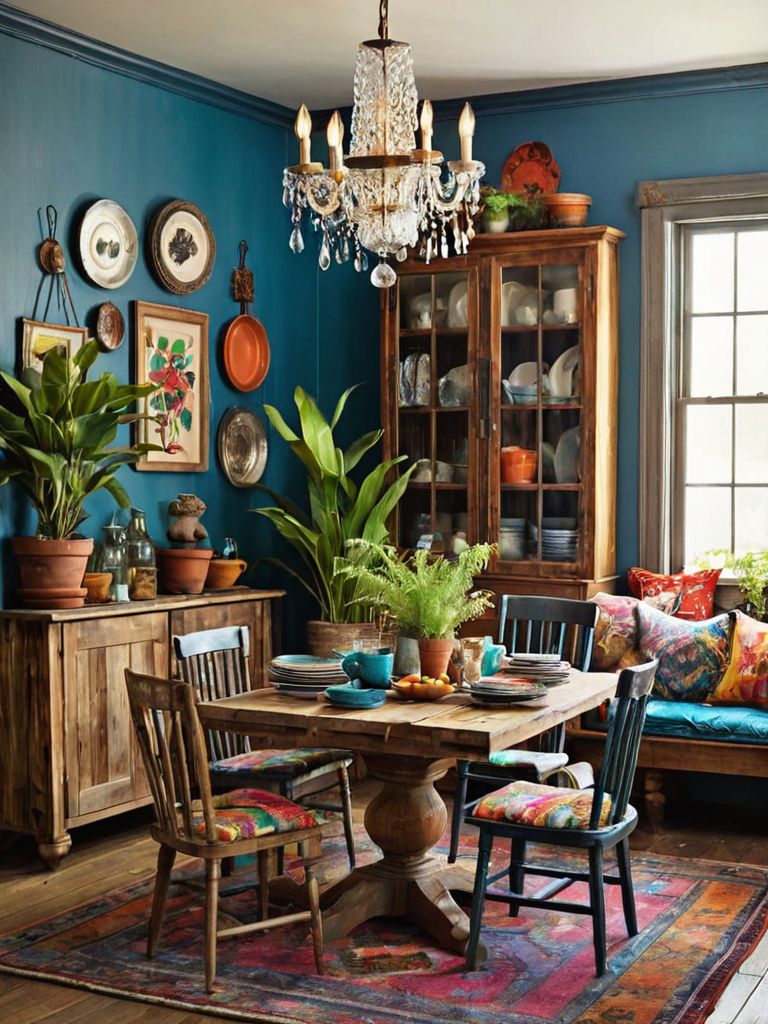 Handmade pottery mugs, Handwoven wool blankets, Vintage glass bottles, Rustic wooden shelves, Farmhouse-style dining tableDescription