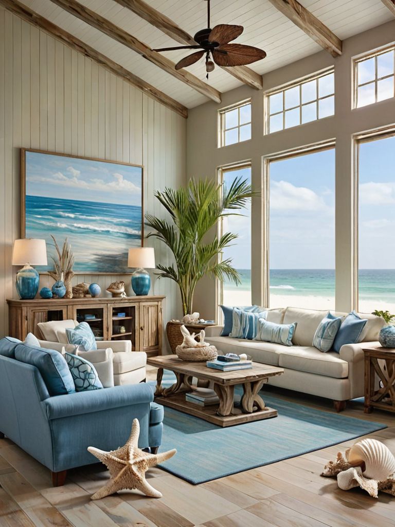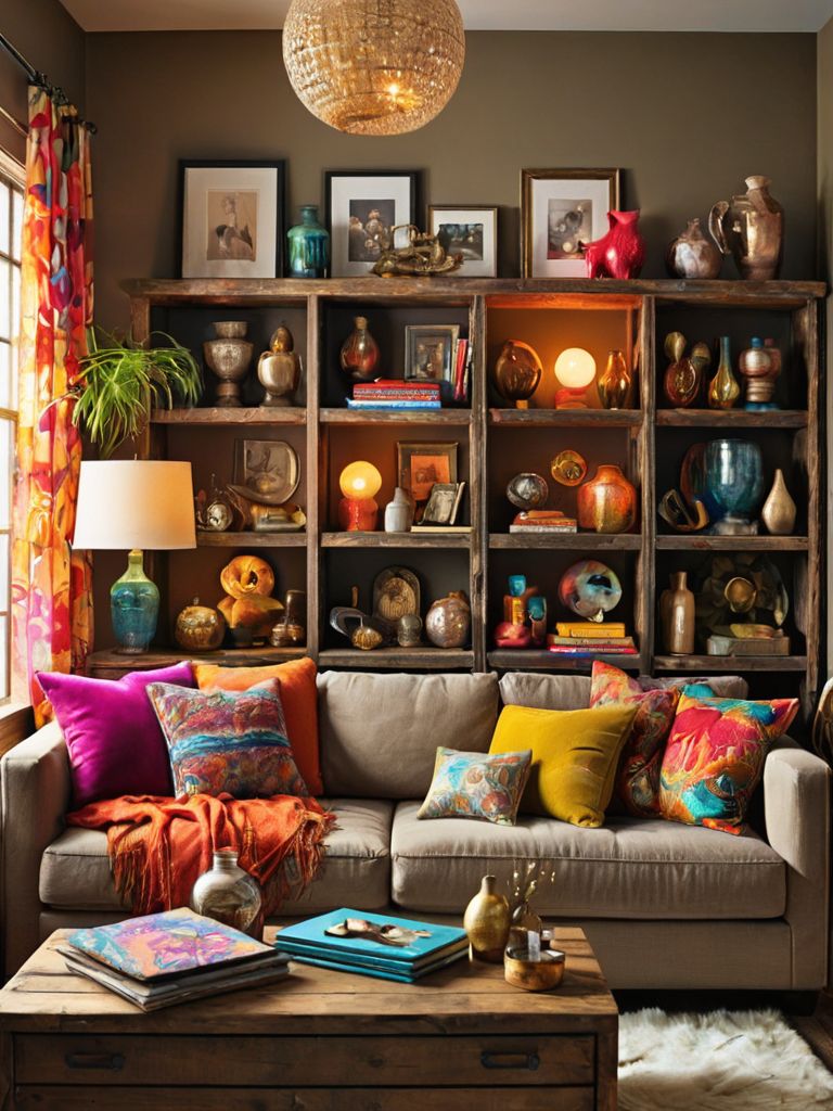 Reclaimed wood shelf, Reclaimed wood coffee table, Distressed finish decor items, Soft, neutral-toned fabrics, Vintage-inspired furnishingsDescription