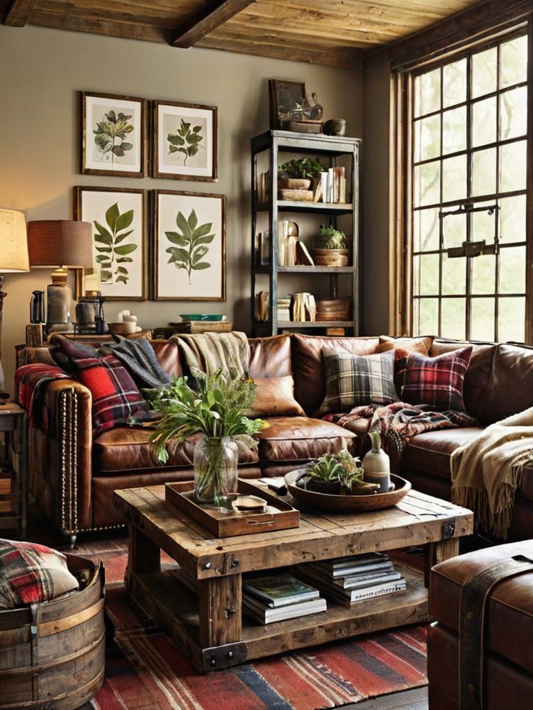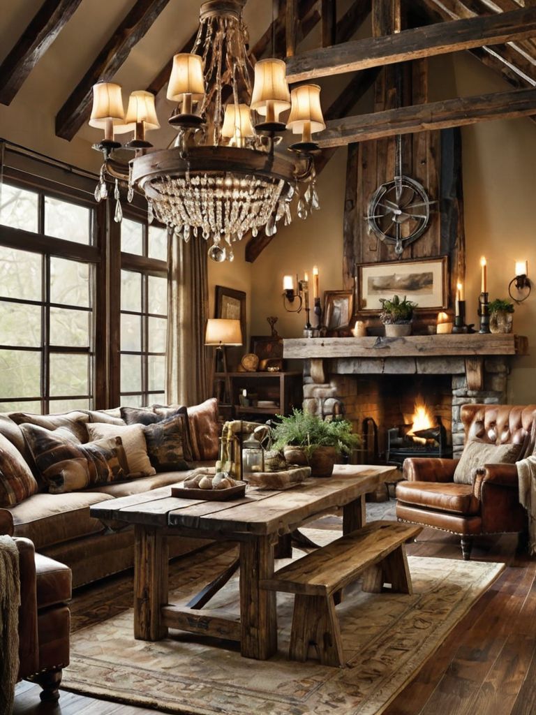 Distressed wood dining table, Vintage-inspired wall clock, Earth-toned throw blankets, Farmhouse-style accent pillows, Rustic lanternsDescription