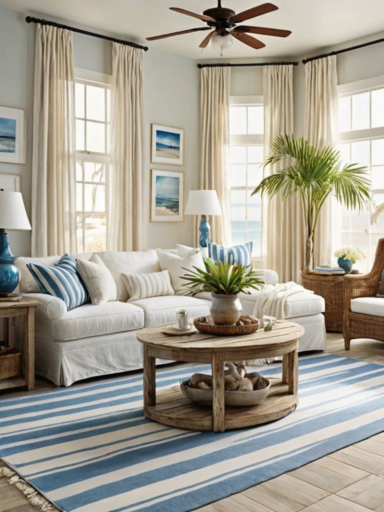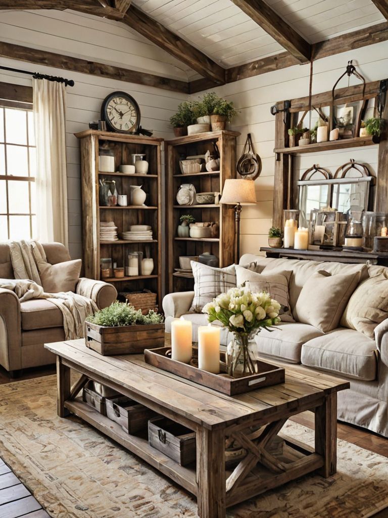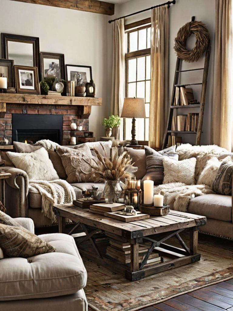 Oversized couch, Textured throw pillows, Distressed wooden coffee table, Vintage-inspired rug, Cozy home decor accessoriesDescription
