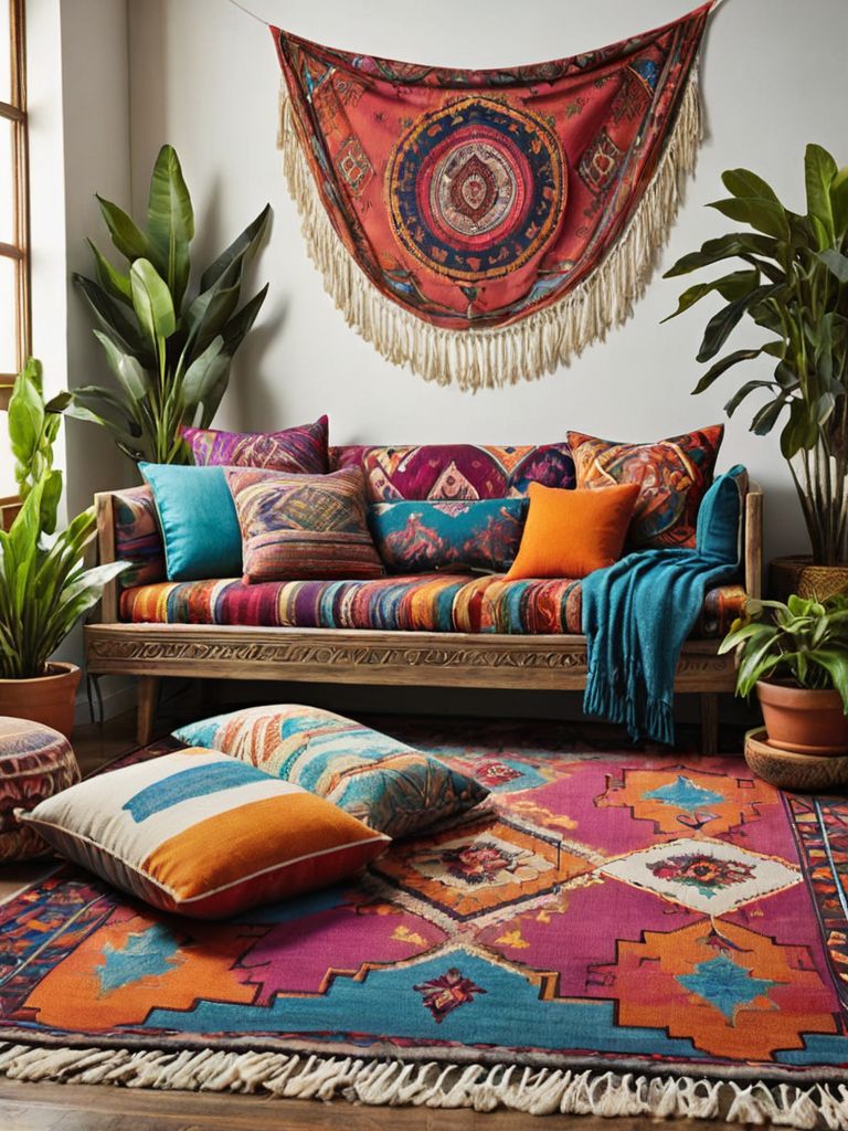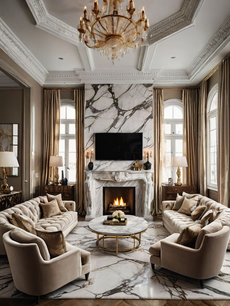 Indulgence: Create a luxurious haven in your living room with opulent velvet drapes cascading down floor-to-ceiling windows, framing a grand fireplace adorned with gilded mirrors and an exquisite chandelier dripping with crystals. Enhance the richness of the space with a plush, oversized sectional sofa in a deep jewel tone, complemented by a handcrafted coffee table adorned with intricate marble inlay. Complete the look with shimmering silk throw pillows and a curated selection of antique vases and sculptures, exuding elegance and extravagance in every corner.