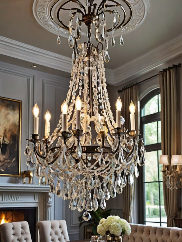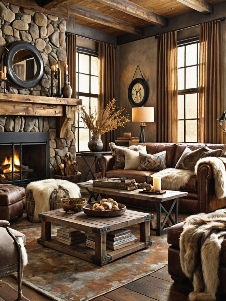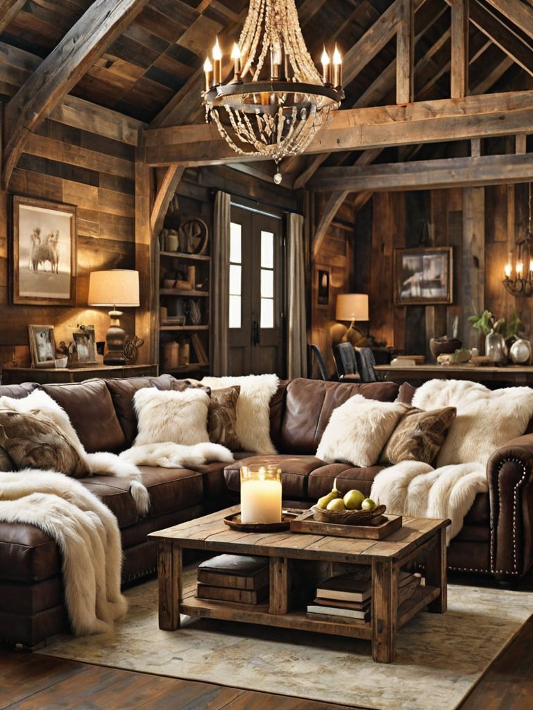 Distressed wooden panels, Antique chandelier, Weathered wooden furniture, Plush pillows, Faux fur rugDescription