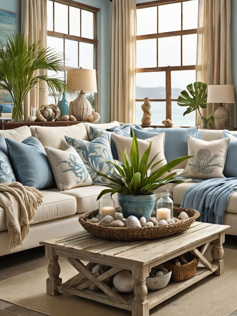 Statement: Oasis-Inspired Living Room Description: Transform your living room into a serene oasis with this home decorating idea. Incorporate a neutral color palette of sandy beiges, earthy browns, and calming blues to create a relaxing atmosphere. Complete the look with natural elements such as bamboo furniture, a cascading indoor waterfall, and scattered desert plants to bring the peacefulness of a desert retreat into your own home.