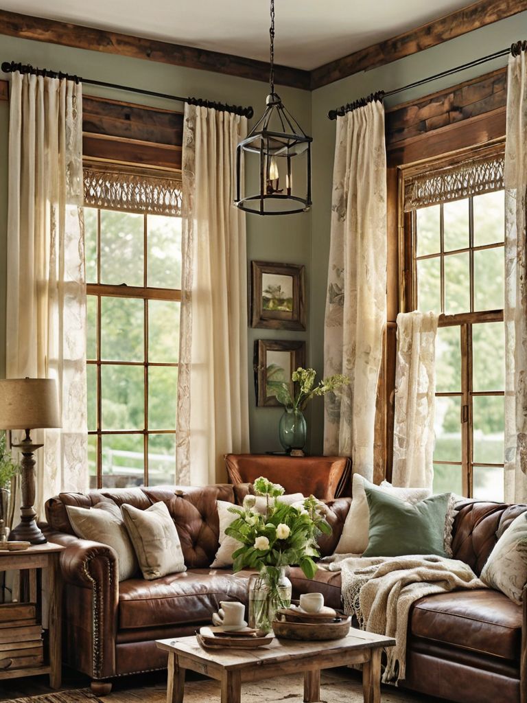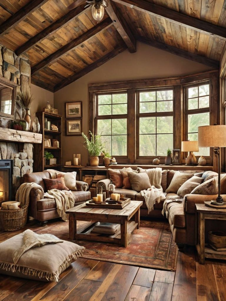 Plush velvet sofa, Assortment of cushions, Weathered wooden coffee table, Vintage books, Cherished trinketsDescription